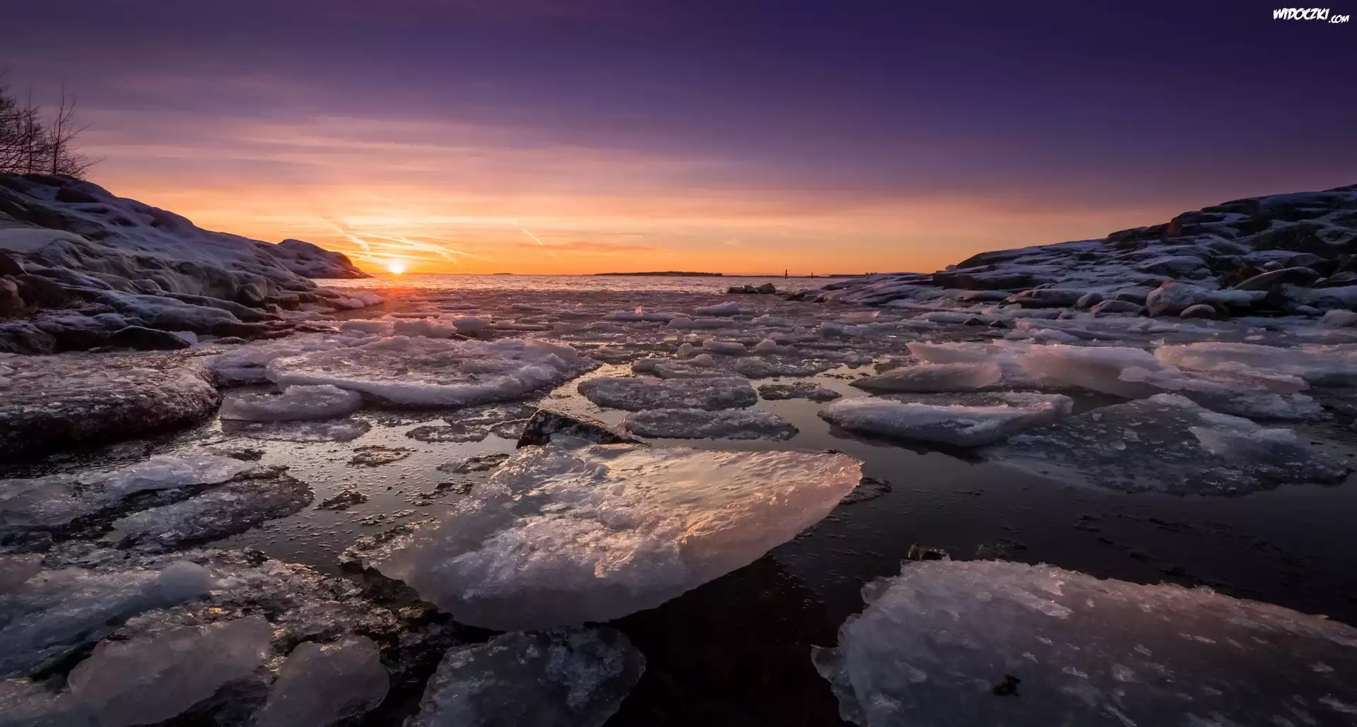 Zdjęcia, Finlandia, Helsinki, Morze Bałtyckie, Zatoka Fińska, Zima, Bryły, Lód, Skały, Wschód słońca