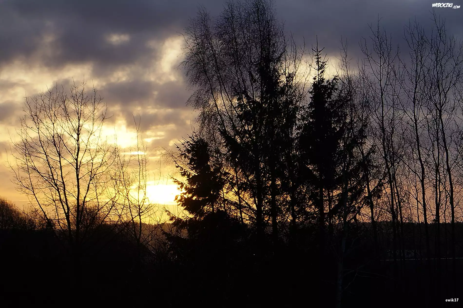 Zdjęcia, Fioletowe,Niebo, Słońce, Choinki, Brzozy