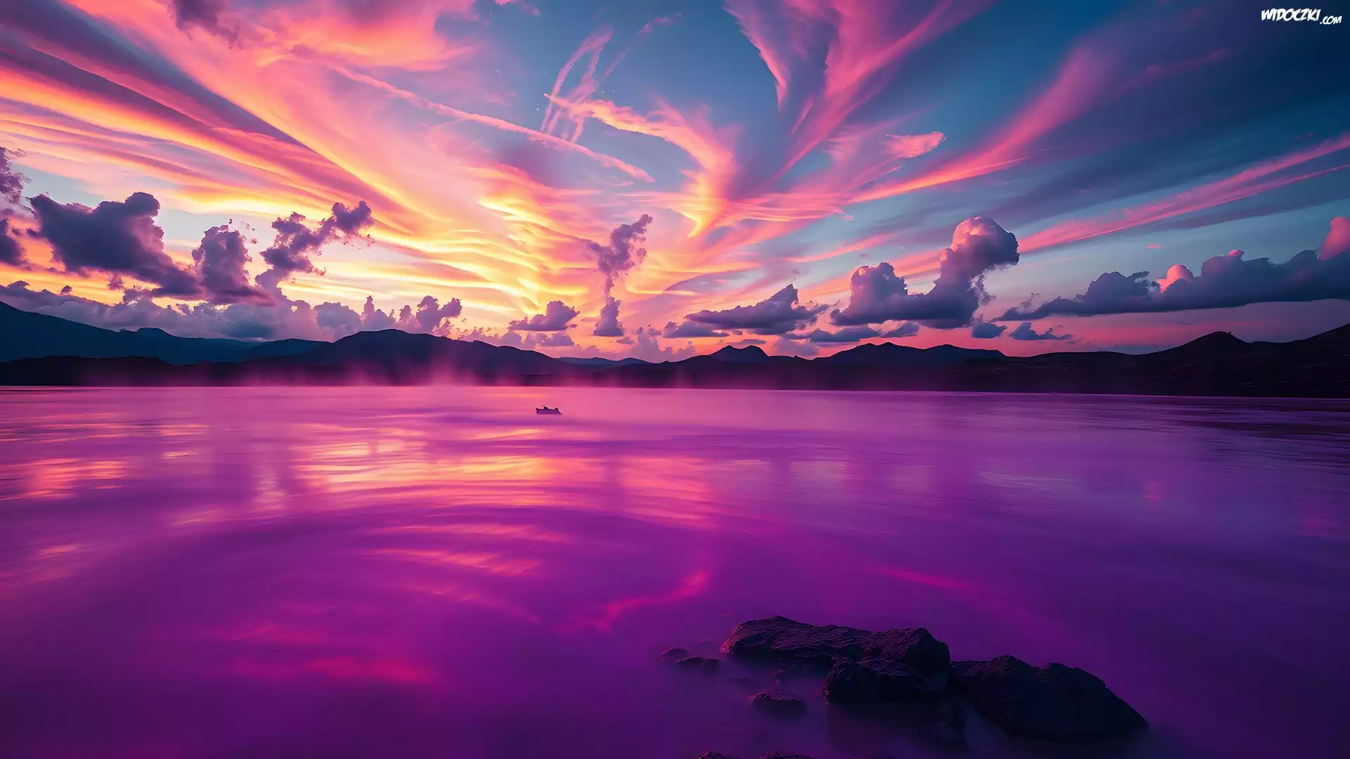 Kolorowe, Niebo, Chmury, Fioletowe, Jezioro, Odbicie