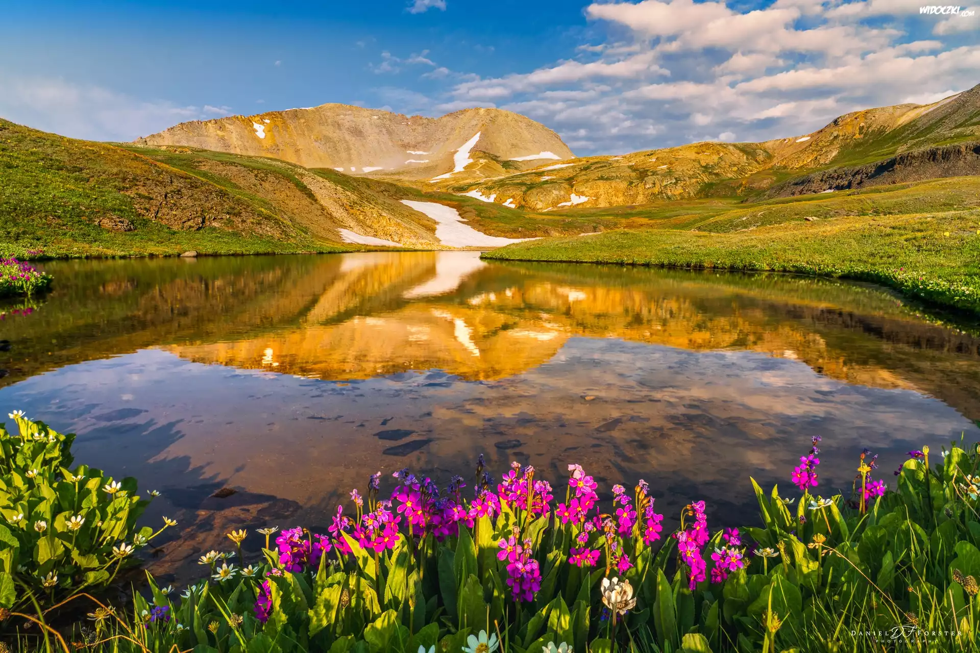 Góry, Jezioro, Kwiaty, Fioletowe, Niebo, Odbicie