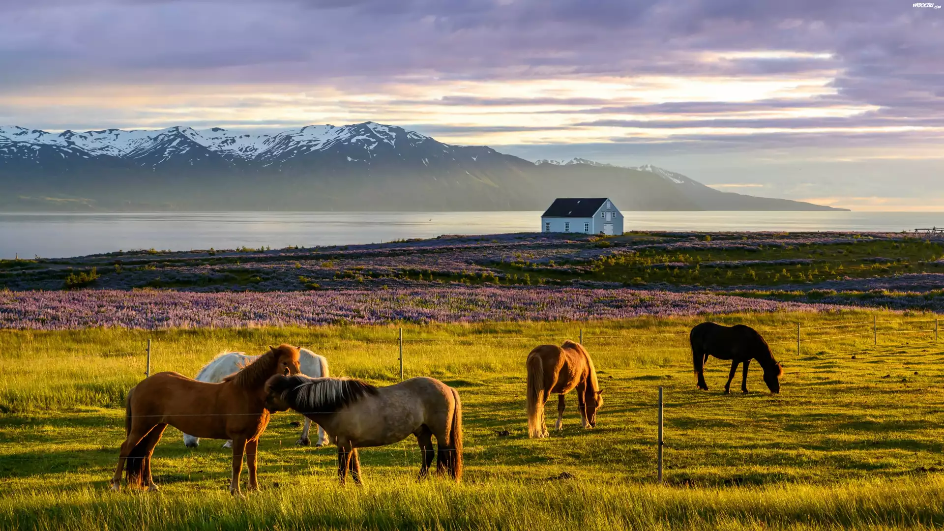 Zdjęcia, Islandia, Fiord Skagafjordur, Konie, Łąka, Wrzosy, Dom