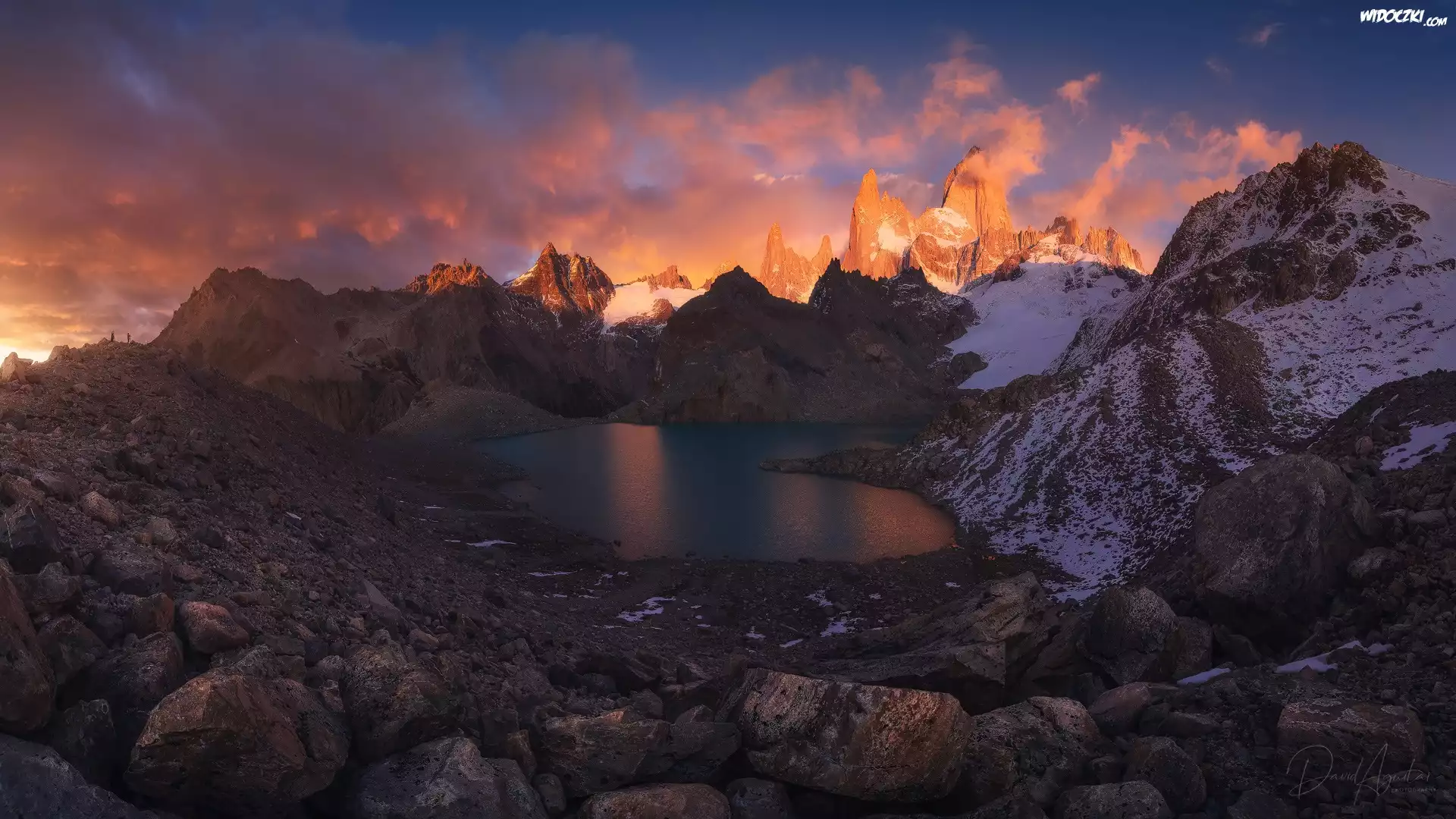 Park Narodowy Los Glaciares, Argentyna, Patagonia, Góry, Szczyt Fitz Roy, Jezioro Sucia, Kamienie, Chmury |