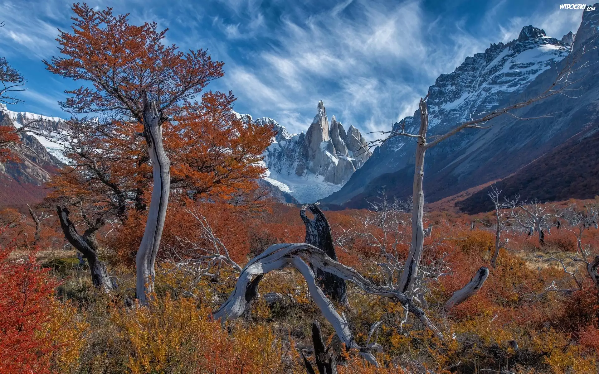 Zdjęcia, Argentyna, Patagonia, El Chalten, Góry, Mount Fitz Roy, Jesień, Drzewa, Konary