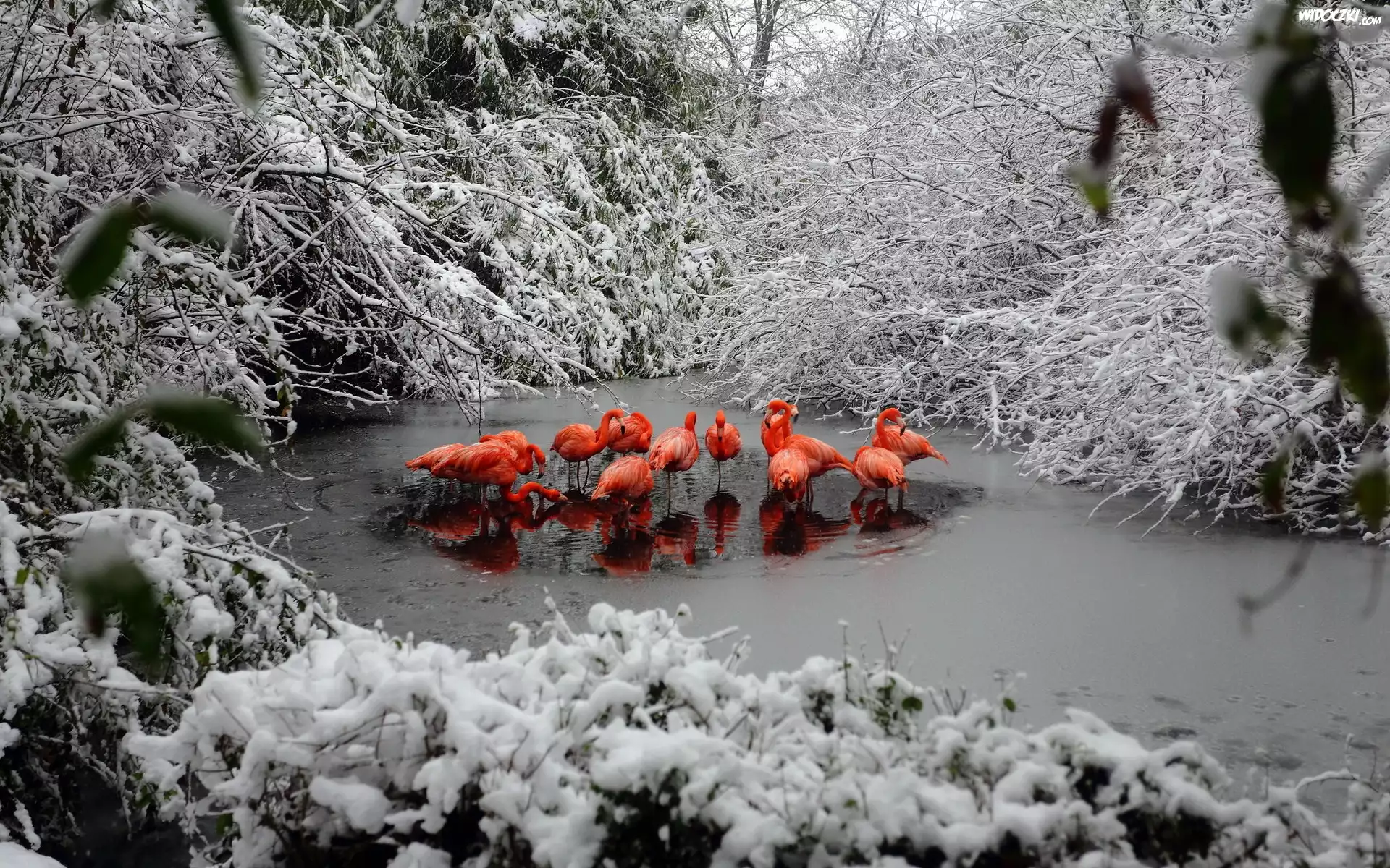 Zdjęcia, Flamingi, Rzeka, Las, Zima