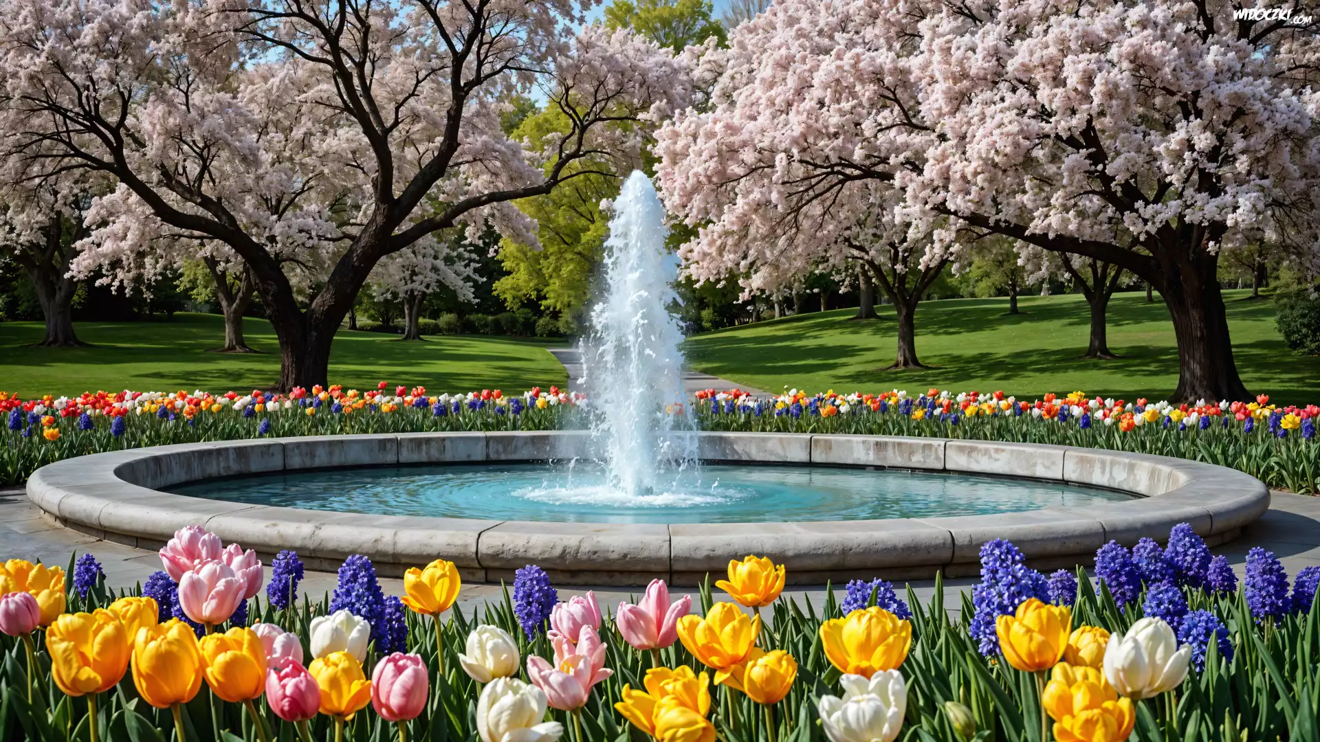 Zdjęcia, Wiosna, Park, Kwiaty, Fontanna, Kwitnące, Drzewa
