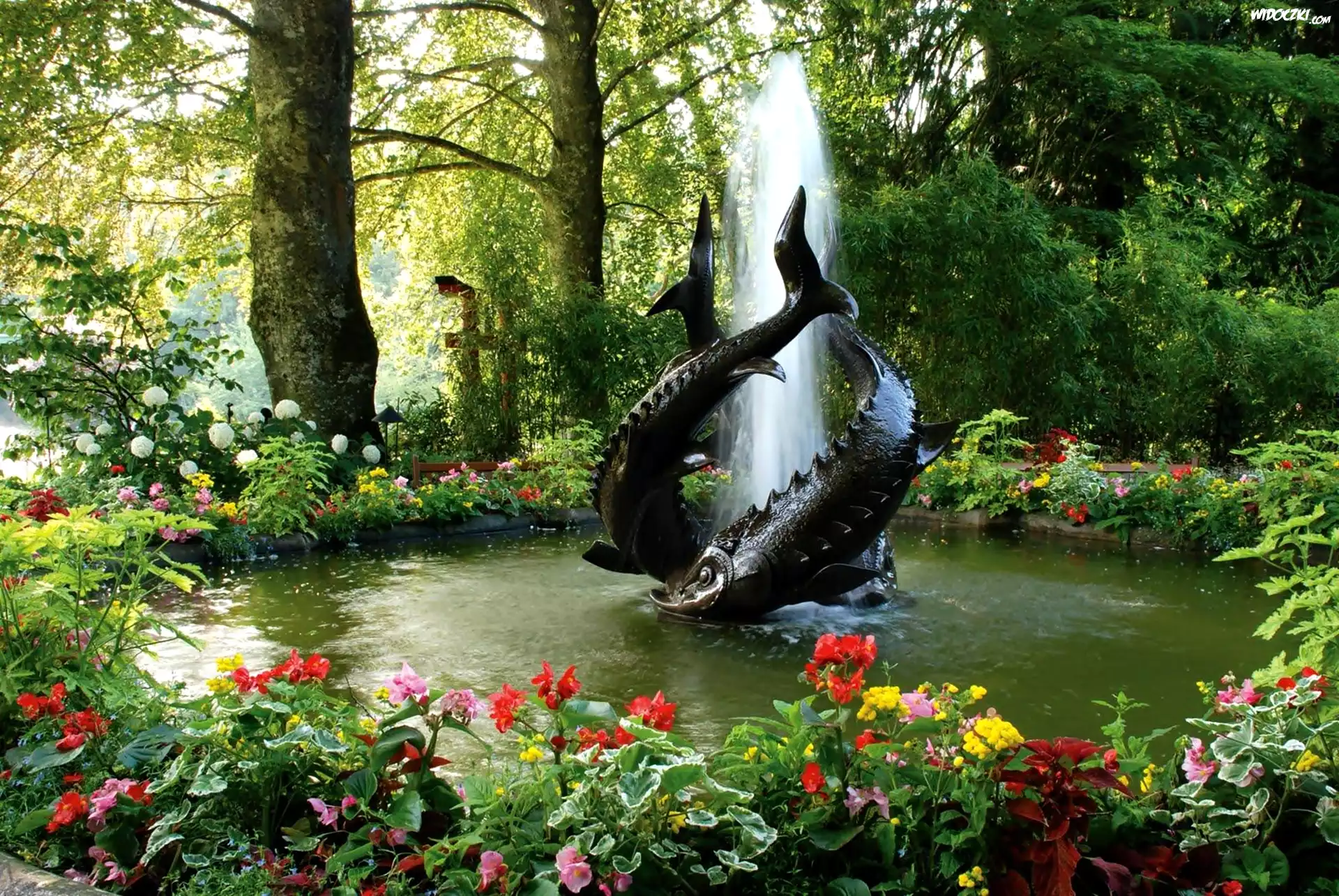 Fontanna, Rekiny, Woda, Kwiaty, Drzewa