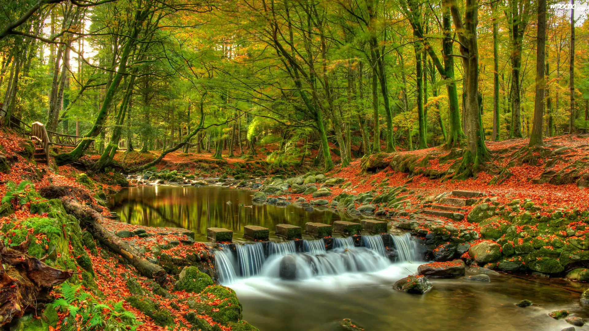 Jesień, Las, Park Tollymore Forest Park, Drzewa, Rzeka Shimne River, Hrabstwo Down, Irlandia Północna |