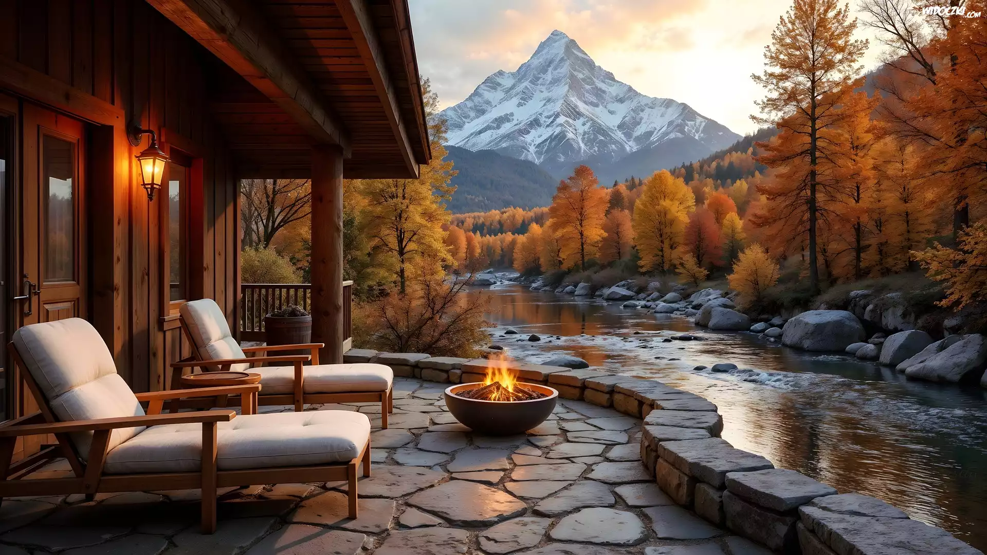 Zdjęcia, Jesień, Góry, Drzewa, Rzeka, Dom, Taras, Ogień, Fotele