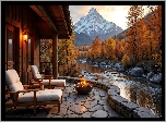 Jesień, Góry, Drzewa, Rzeka, Dom, Taras, Ogień, Fotele