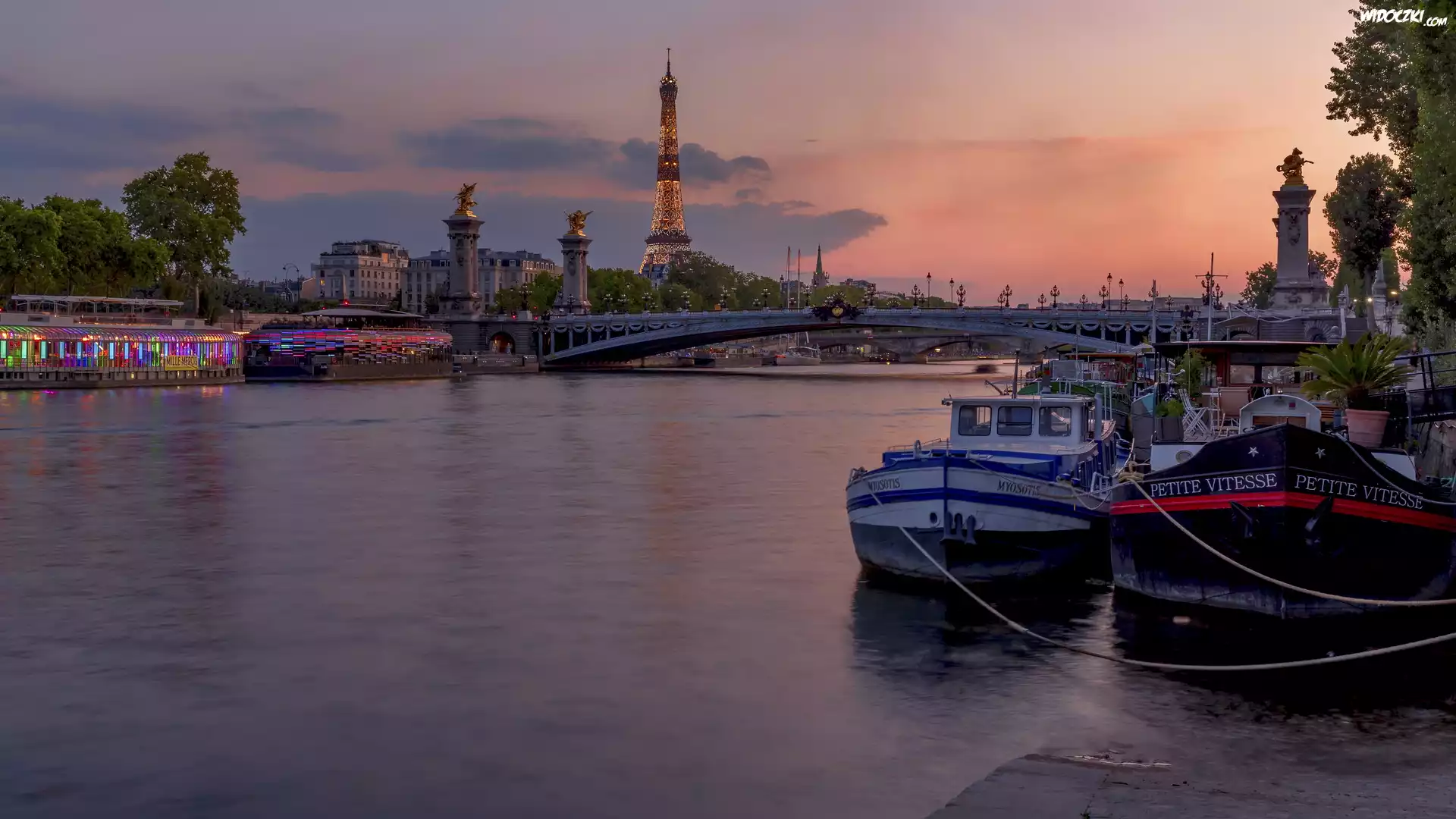 Zdjęcia, Rzeka Sekwana, Łódki, Most Aleksandra III, Wieża Eiffla, Paryż, Francja