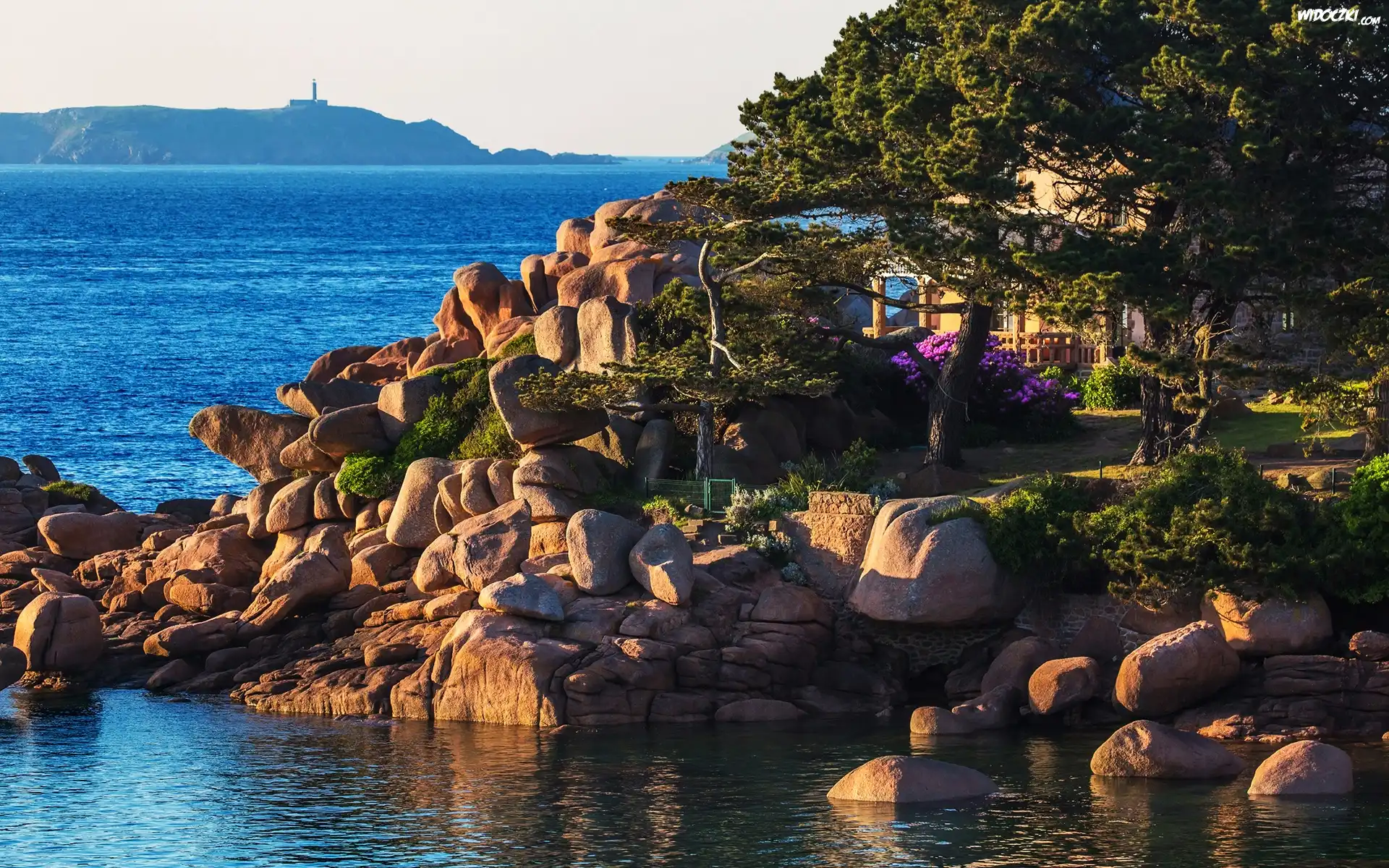 Morze, Brzeg, Kamienie, Drzewa, Dom, Miejscowość Saint Guirec, Bretania, Francja