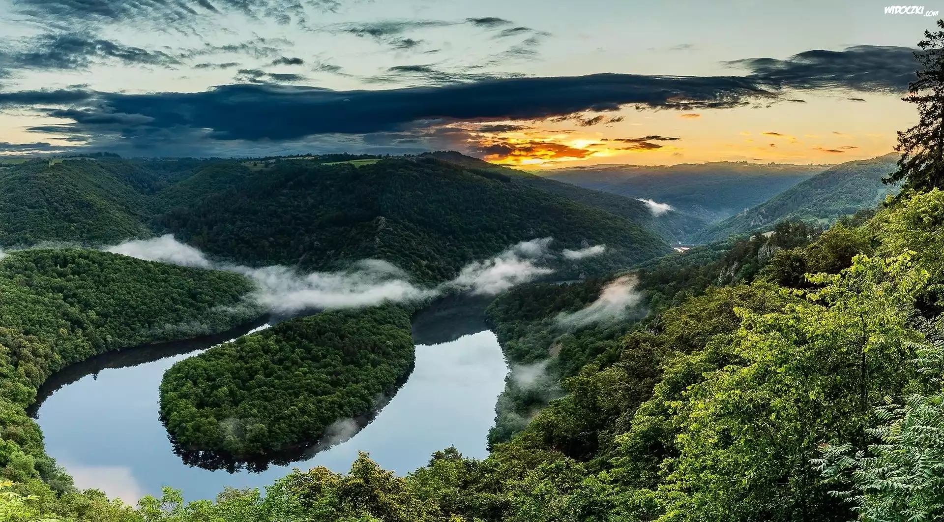 Zdjęcia, Francja, Rzeka Sioule, Meander, Lasy, Mgła