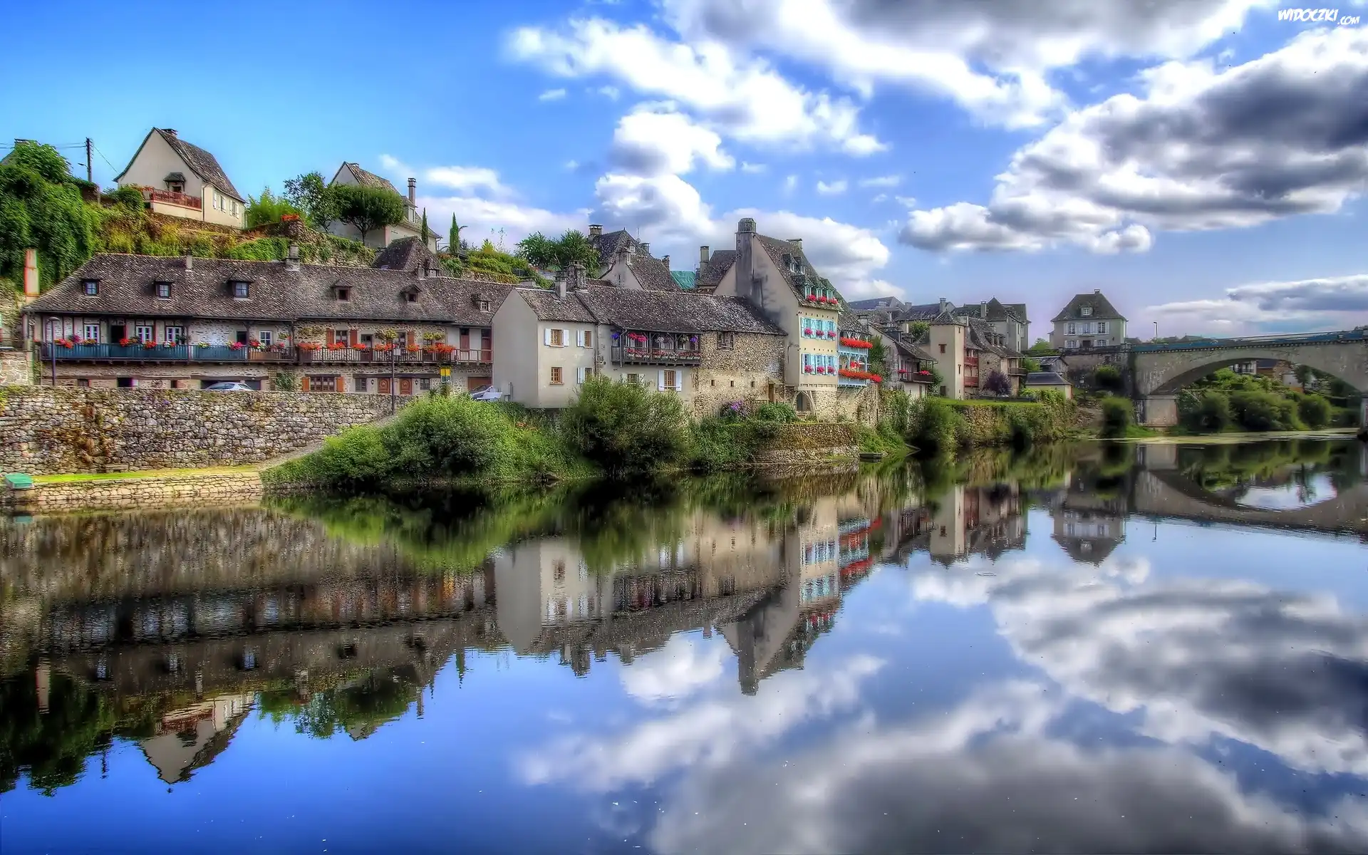 Francja, Kamienice, Rzeka, Most, Chmury
