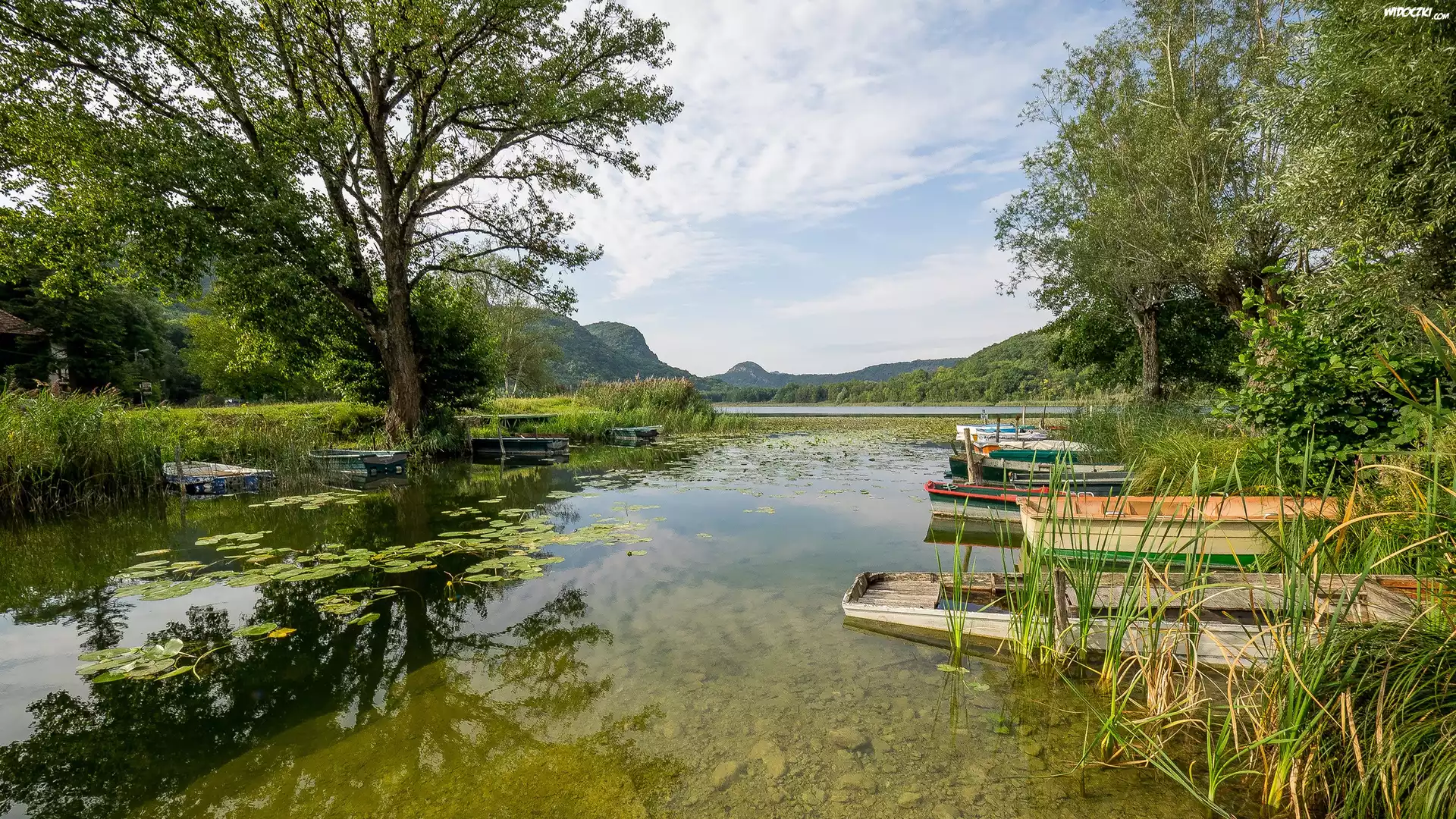 Zdjęcia, Jezioro Barterand, Łódki, Brzeg, Drzewa, Góry, Miejscowość Pollieu, Francja