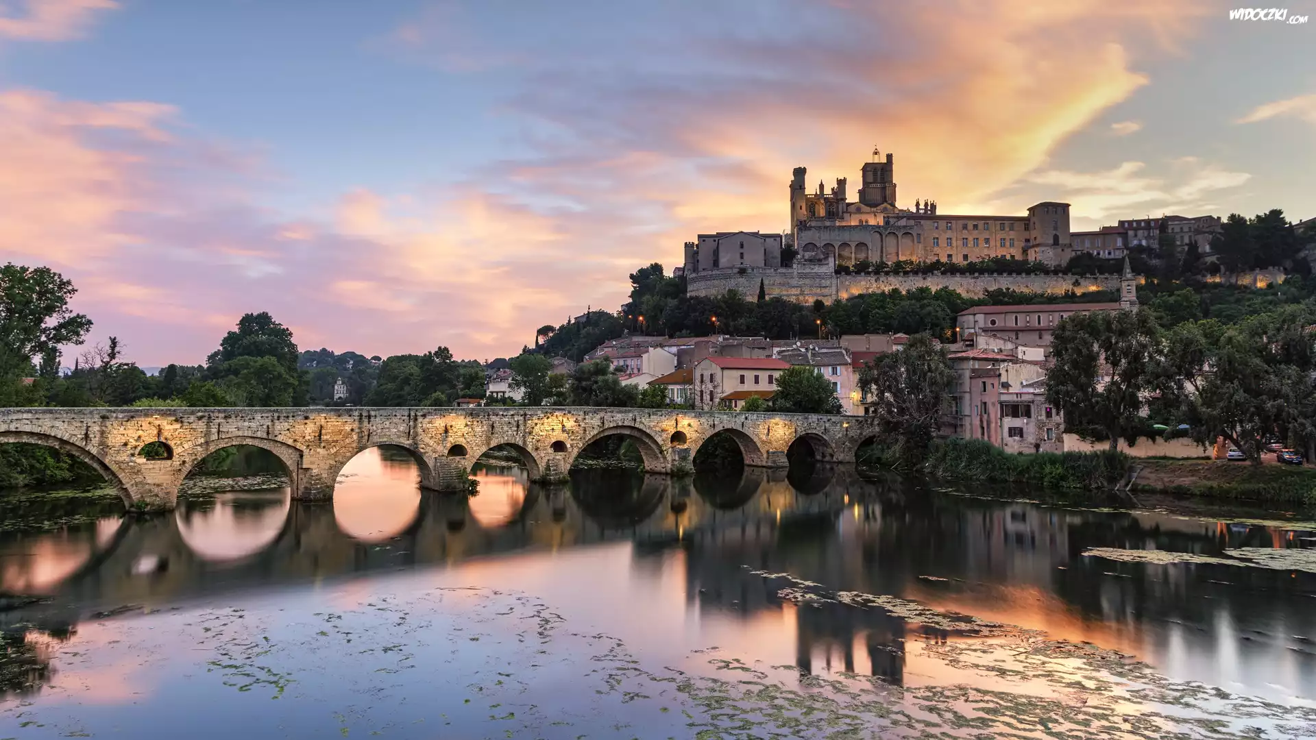Francja, Beziers, Rzeka Orb, Most, Drzewa, Kościół, Katedra, Beziers Cathedral, Budynki, Wschód słońca |
