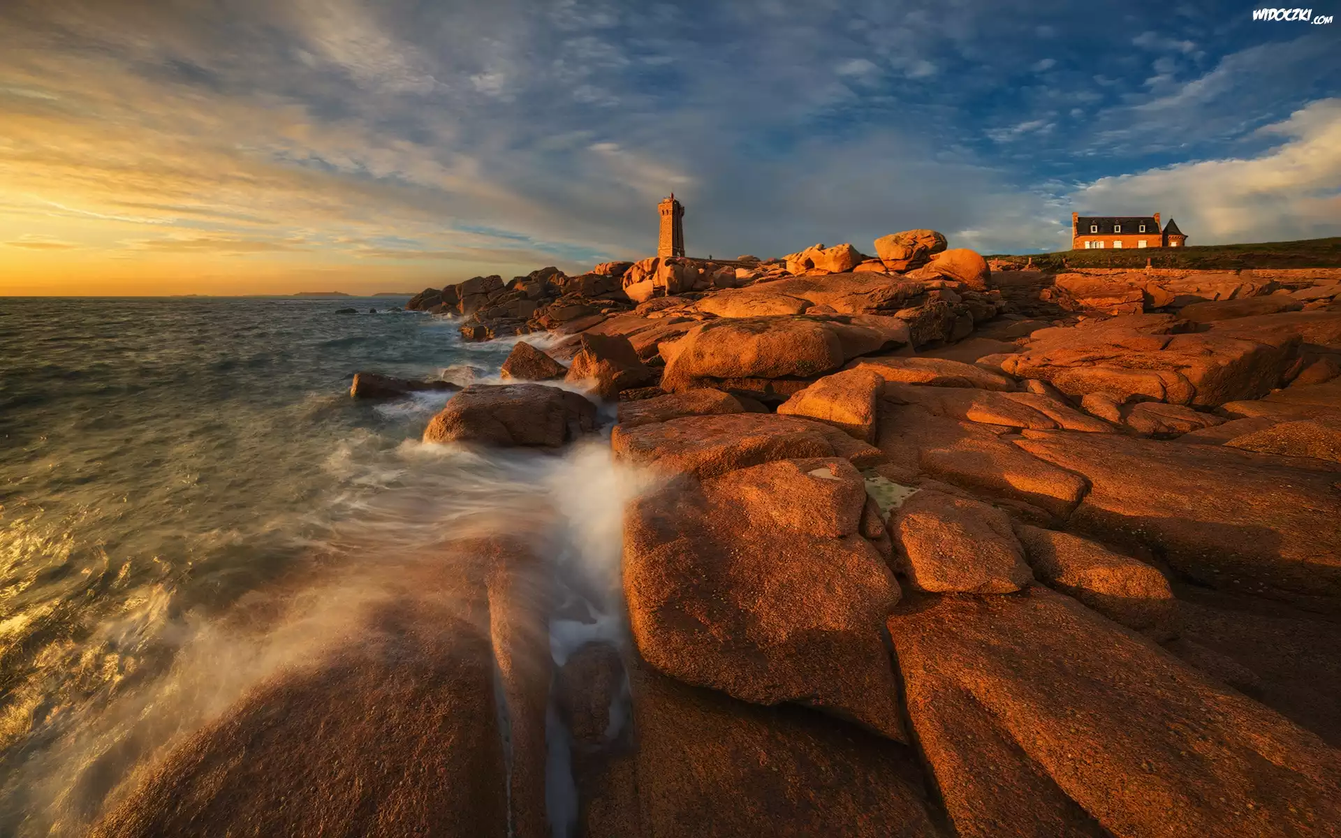 Francja, Bretania, Miejscowość Perros-Guirec, Latarnia morska Ploumanach, Morze, Skały, Chmury, Wschód słońca |