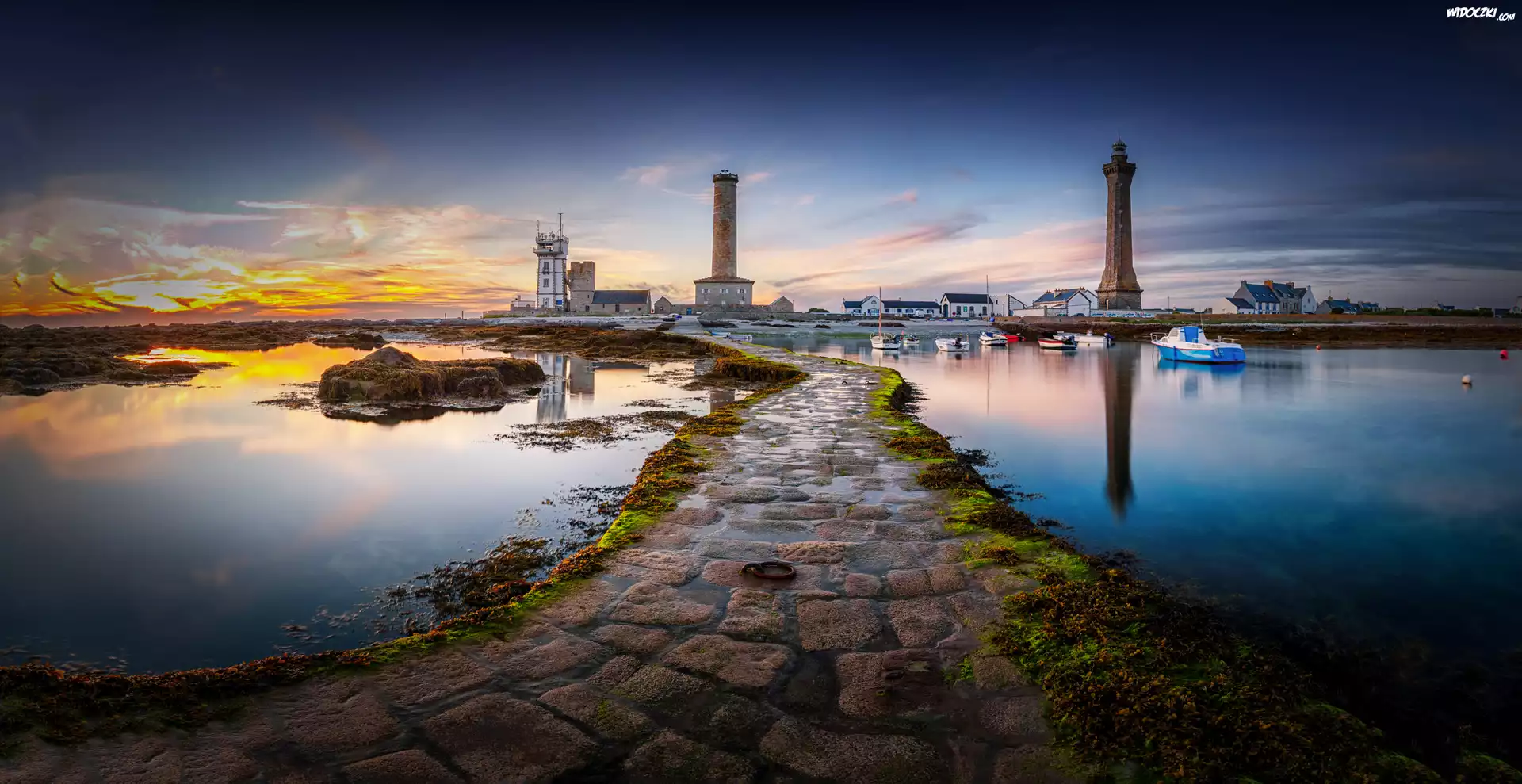 Zdjęcia, Francja, Bretania, Kersuluan, Wybrzeże, Łódki, Droga, Latarnia morska, Phare dEckmuhl
