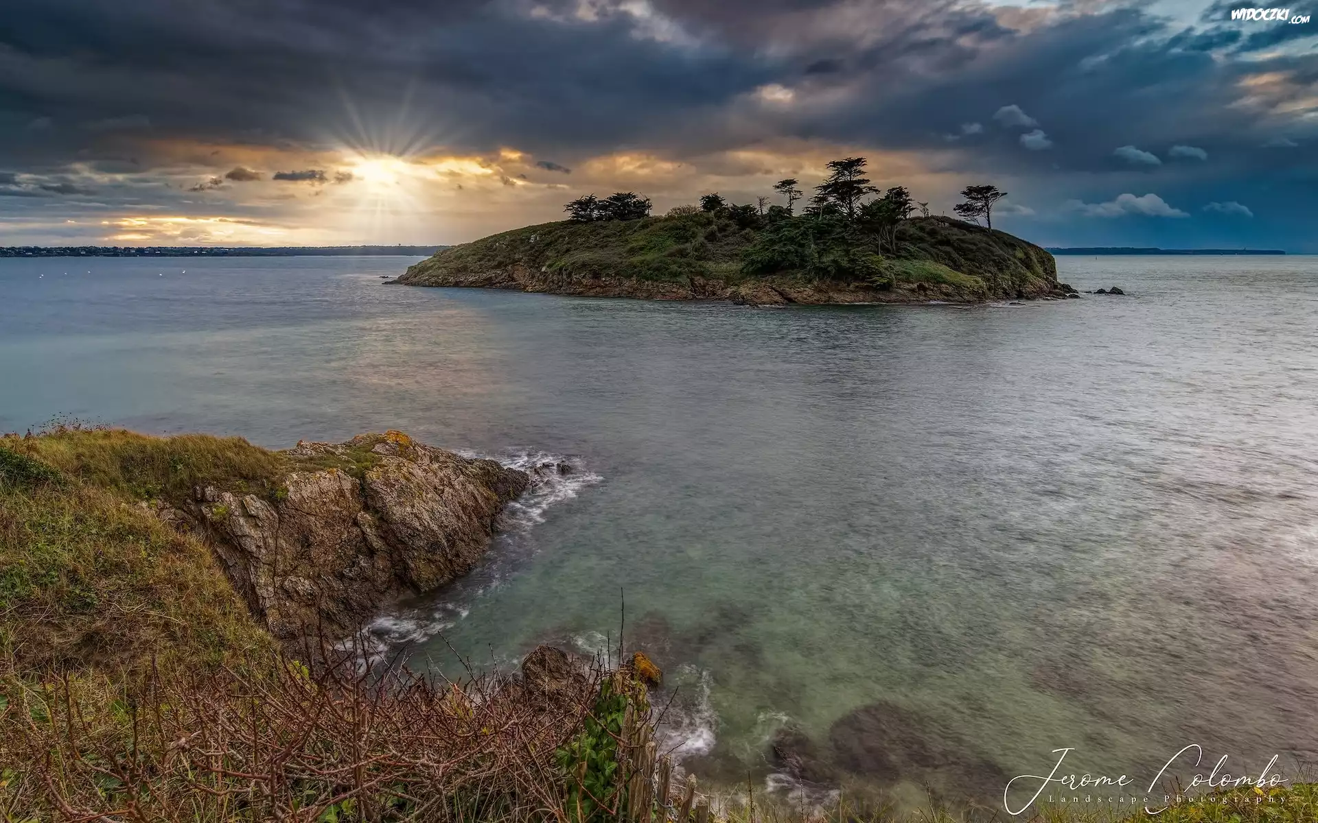 Zdjęcia, Morze, Wybrzeże, Wysepka, Skały, Promienie słońca, Roślinność, Bretania, Francja