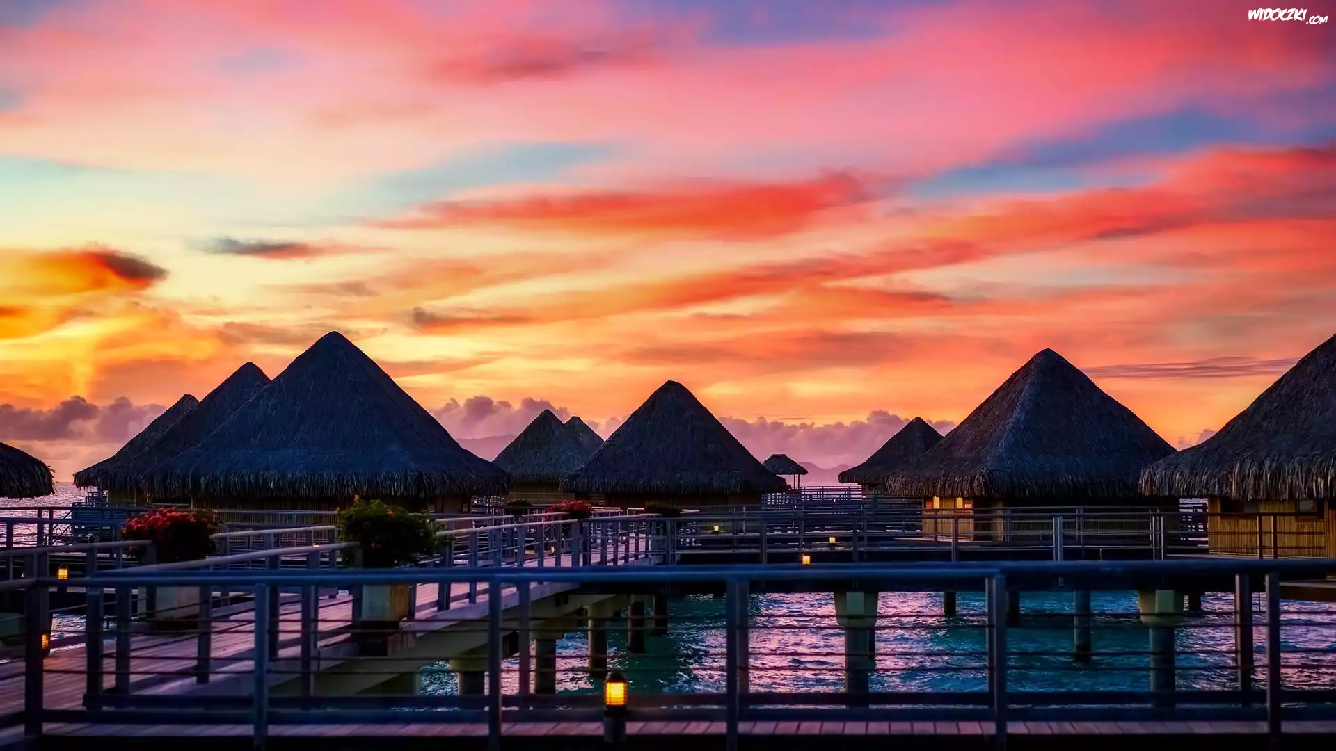 Zdjęcia, Domki, Pomosty, Zachód słońca, Bora Bora, Polinezja Francuska, Francja