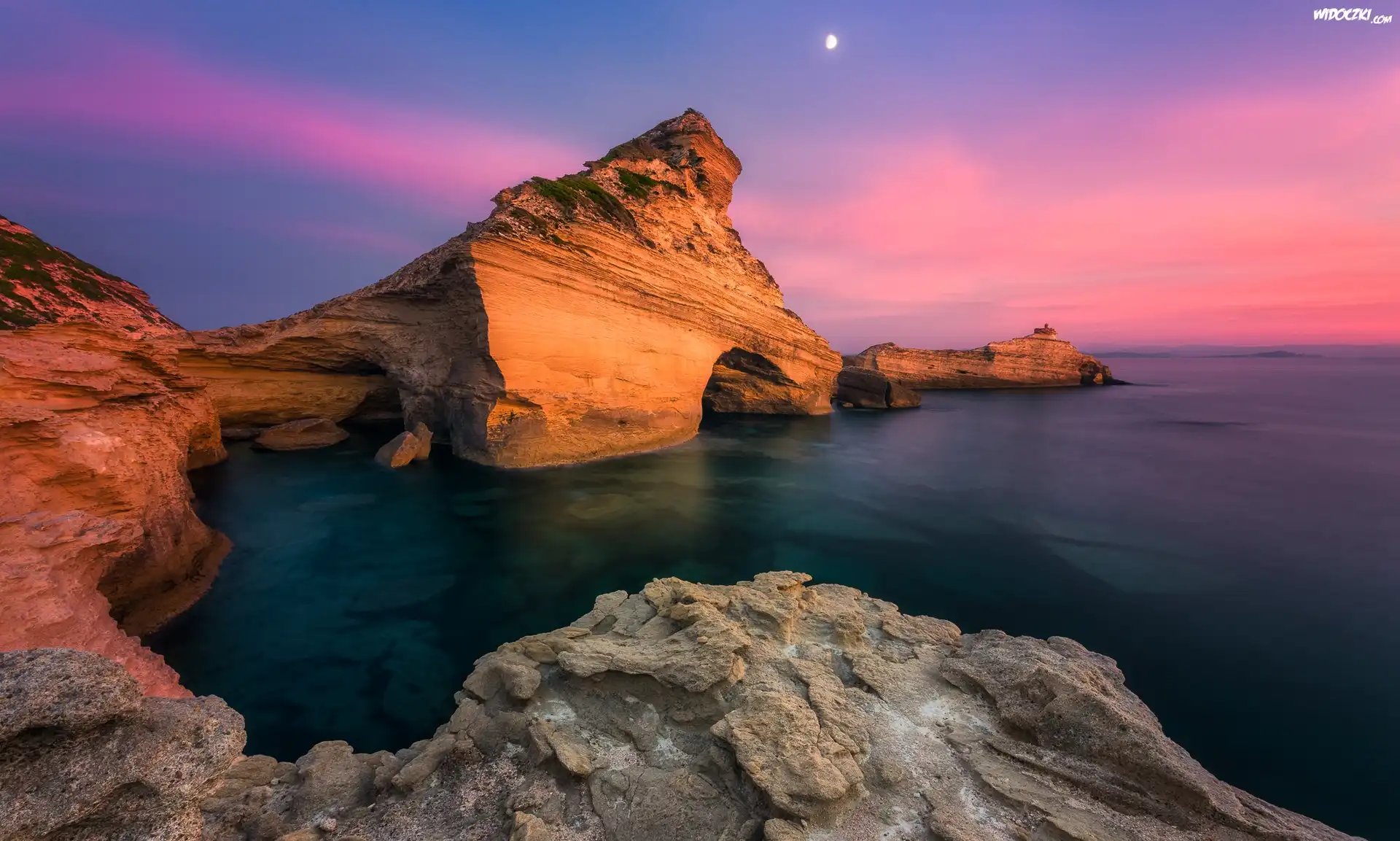Morze, Skały, Przylądek Pertusato, Zachód słońca, Księżyc, Bonifacio, Korsyka, Francja