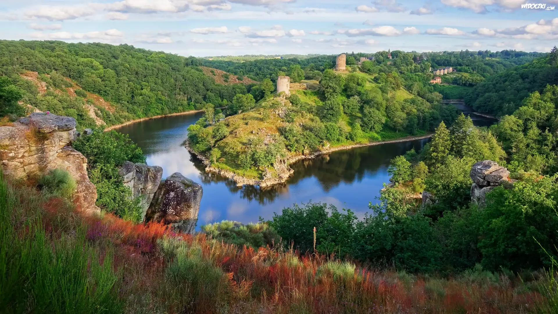 Zdjęcia, Rzeka Creuse, Zakole, Ruiny, Zamek Crozant, Miejscowość Crozant, Creuse, Francja