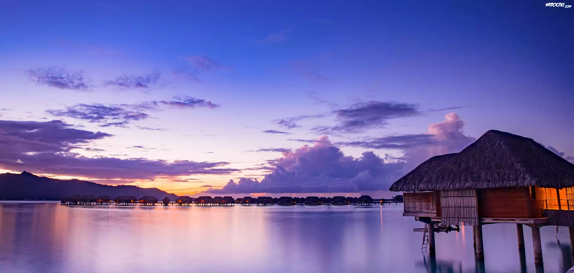 Zdjęcia, Polinezja Francuska, Bora Bora, Zachód Słońca, Morze, Domy