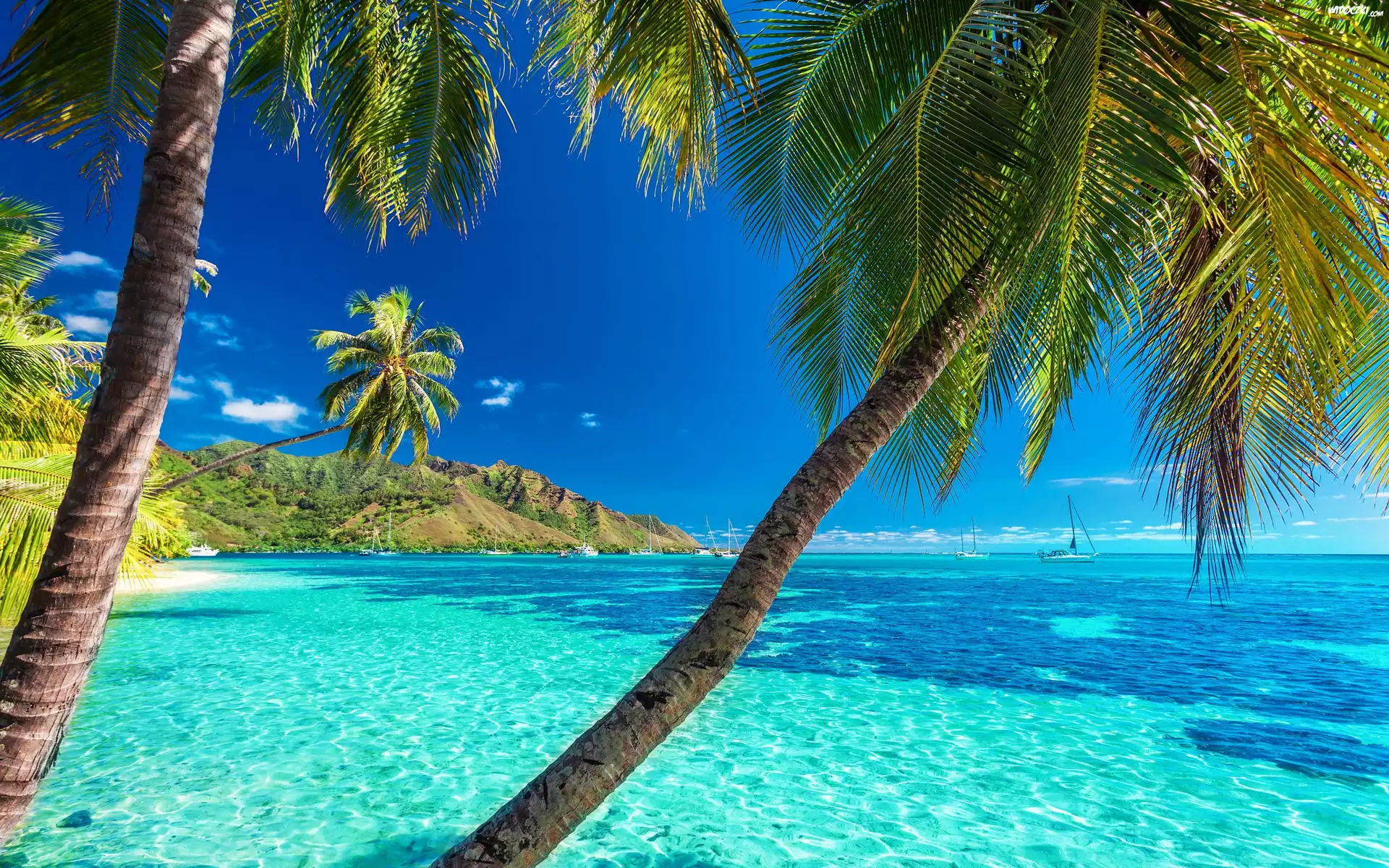 Polinezja Francuska, Wyspa Moorea, Palmy, Ocean, Jachty, Lato, Wakacje