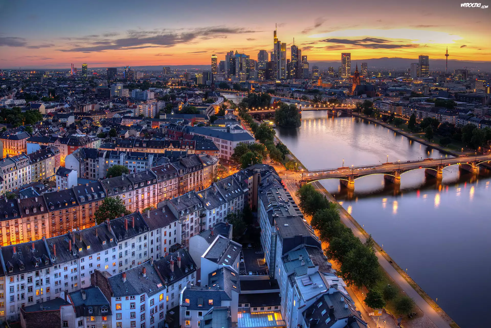 Zdjęcia, Frankfurt, Niemcy, Noc, Most, Rzeka, Dom