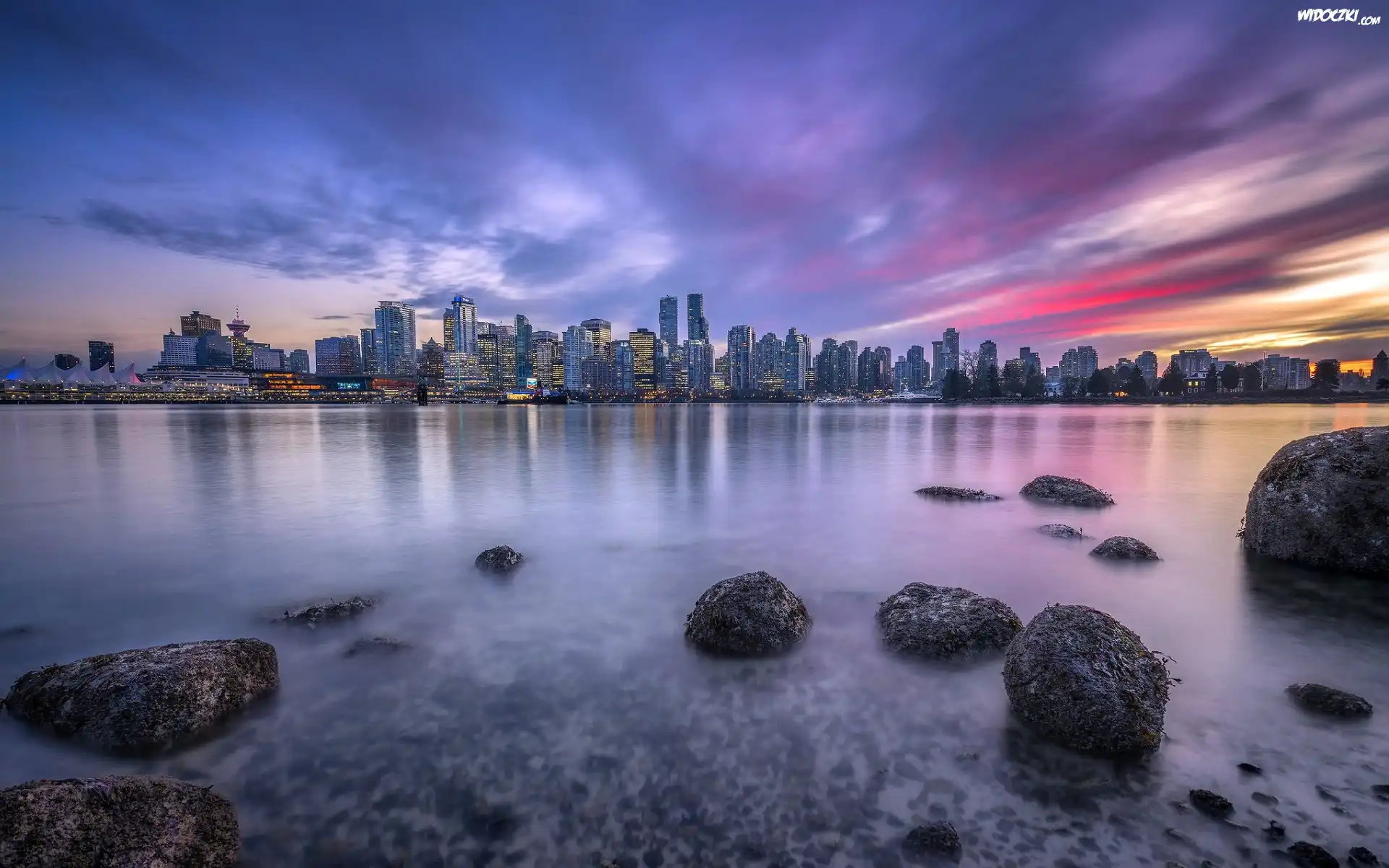Vancouver, Rzeka Fraser, Kamienie, Wieżowce, Zachód słońca, Prowincja Kolumbia Brytyjska, Kanada |