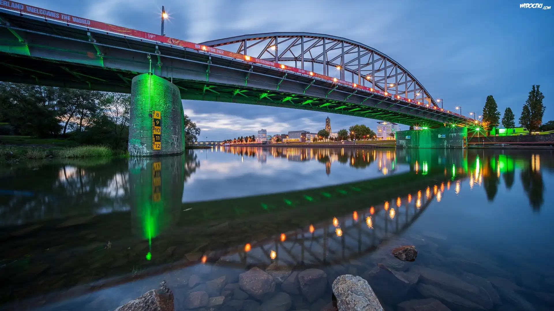 Rzeka, Dolny Ren, Podświetlony, Most, John Frost Bridge, Drzewa, Arnhem, Holandia