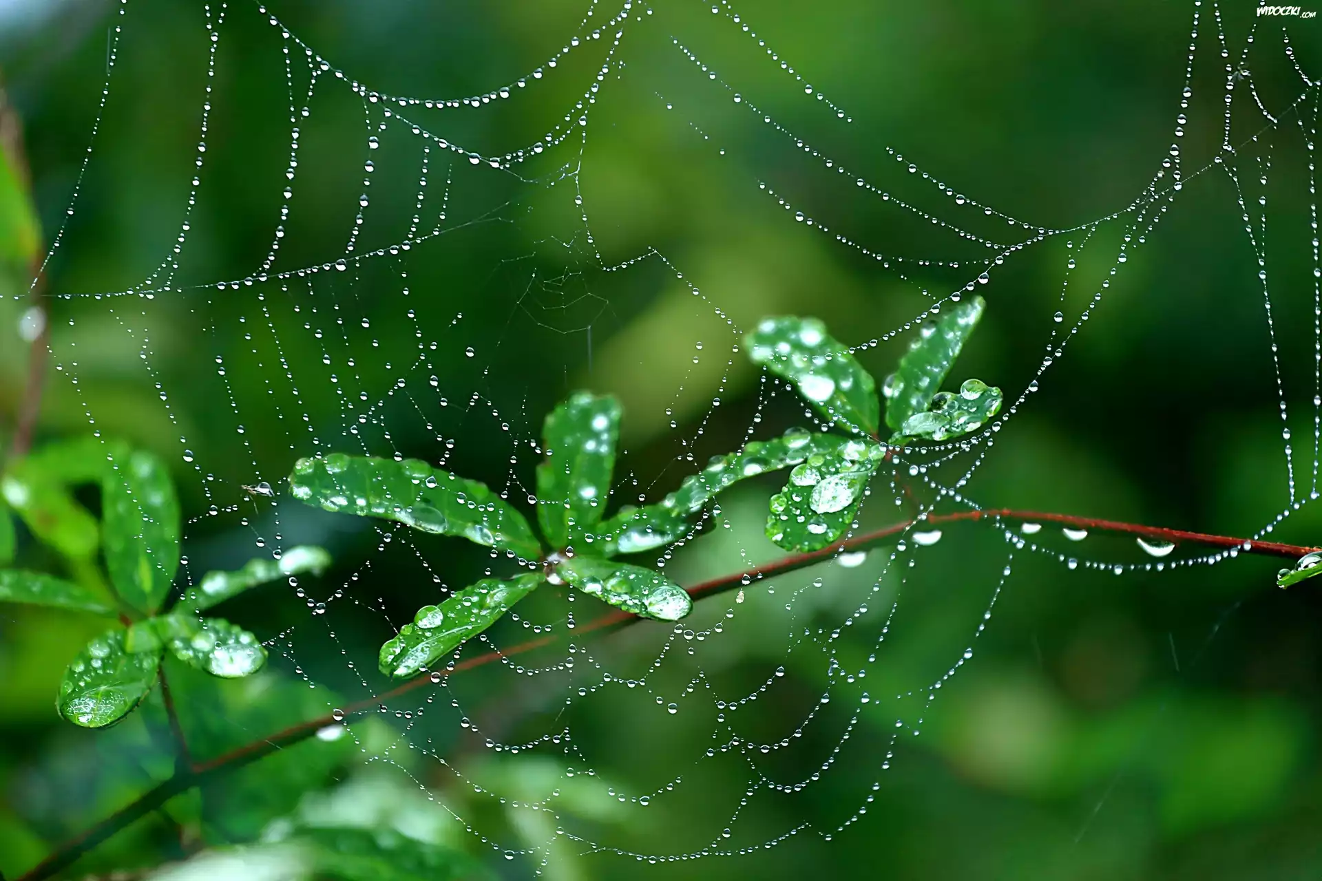 Gałązka, Listki, Pajęczyna, Krople, Deszczu
