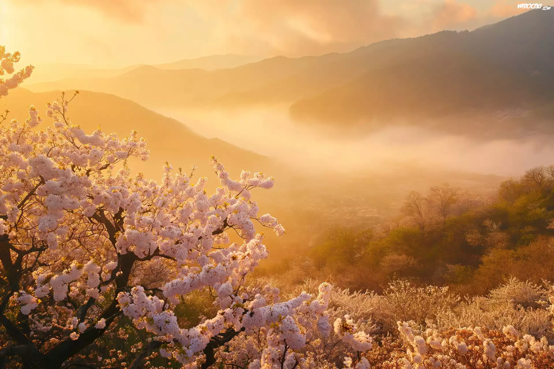 Zdjęcia, Wiosna, Okwiecone, Drzewo, Gałązki, Mgła, Góry, Poranek