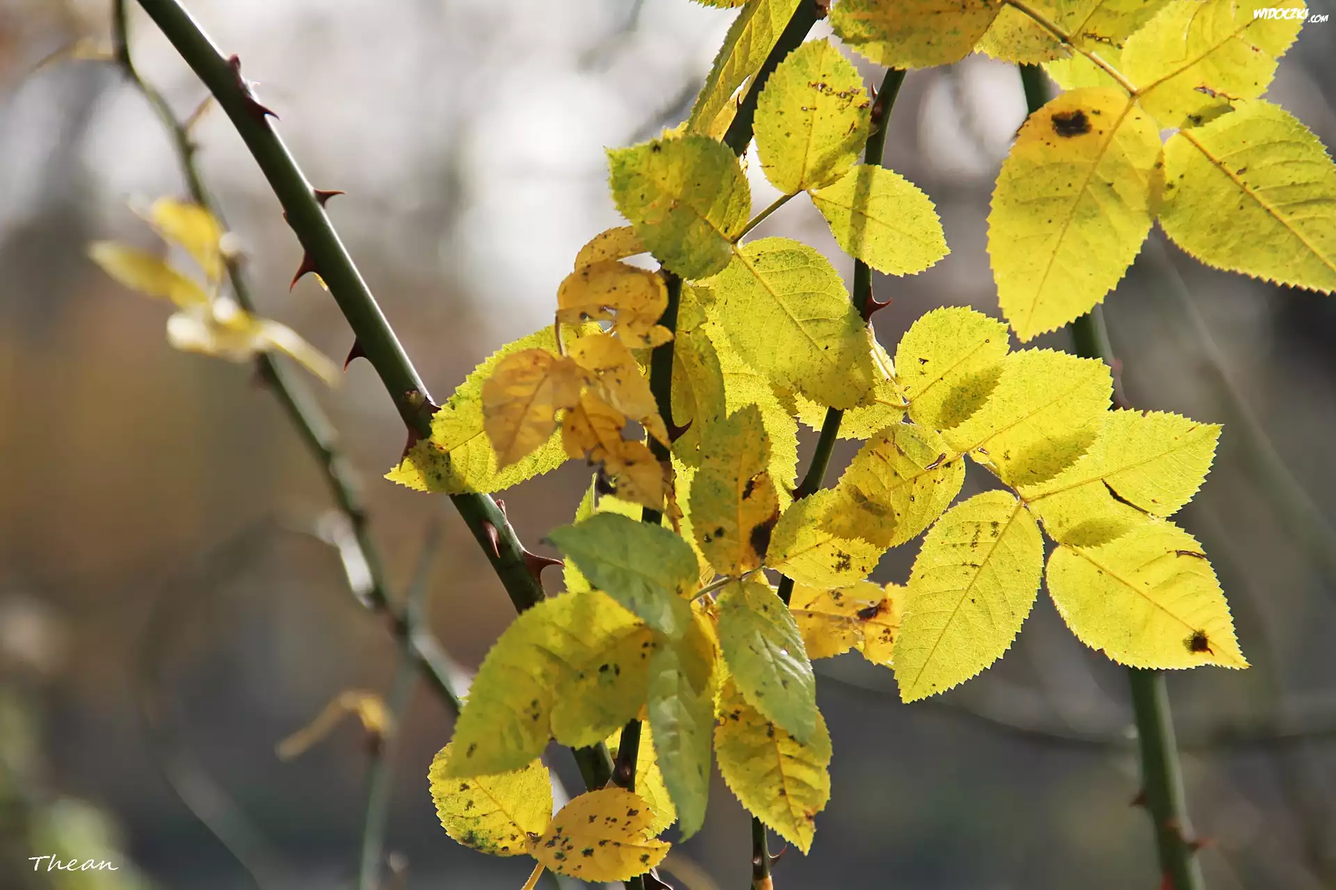 Zdjęcia, Żółte, Liście, Róży, Gałązki, Kolce