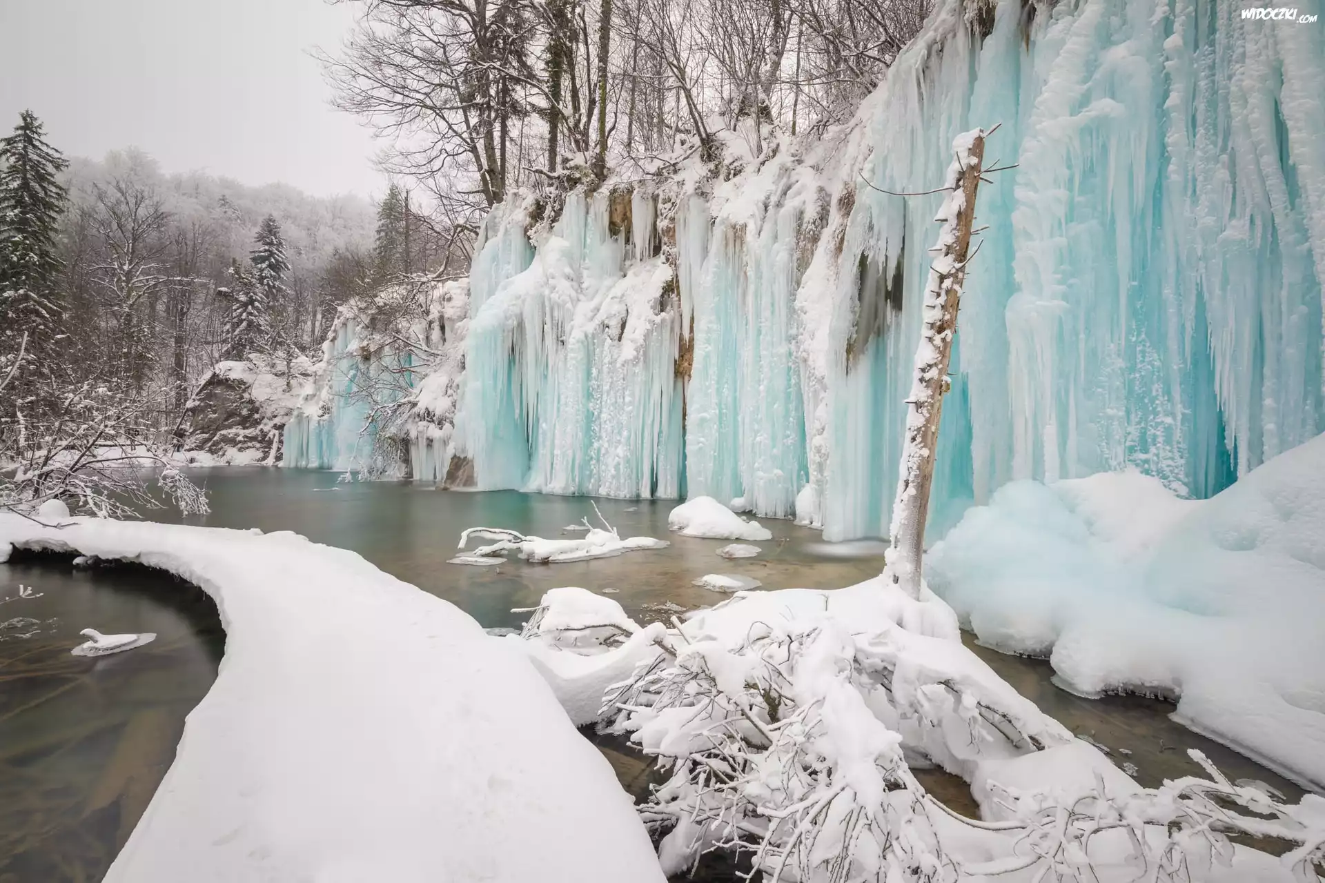 Zdjęcia, Zima, Śnieg, Drzewa, Gałęzie, Skały, Wodospad