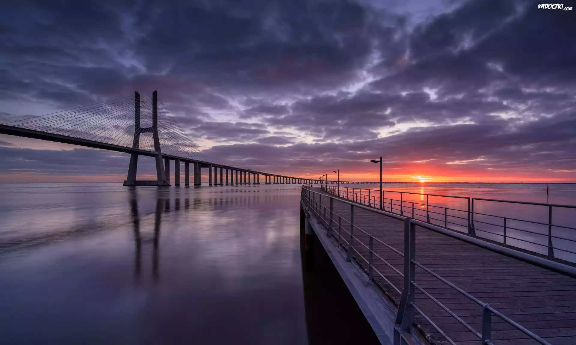 Zdjęcia, Rzeka Tag, Zachód słońca, Niebo, Chmury, Most, Vasco da Gama, Lizbona, Portugalia