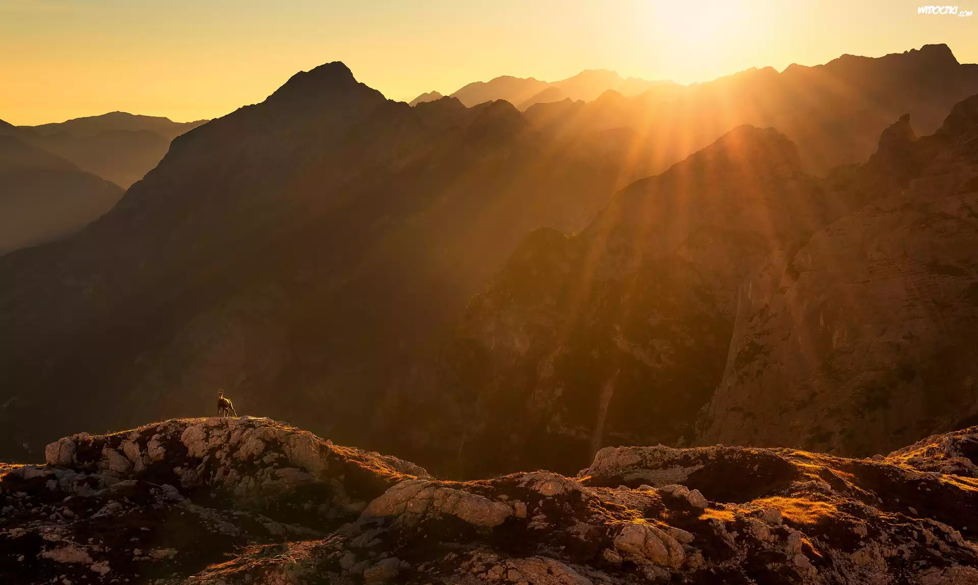 Zdjęcia, Góry, Alpy Julijskie, Góra Bovski Gamsovec, Promienie słońca, Zbocze, Koza górska, Słowenia