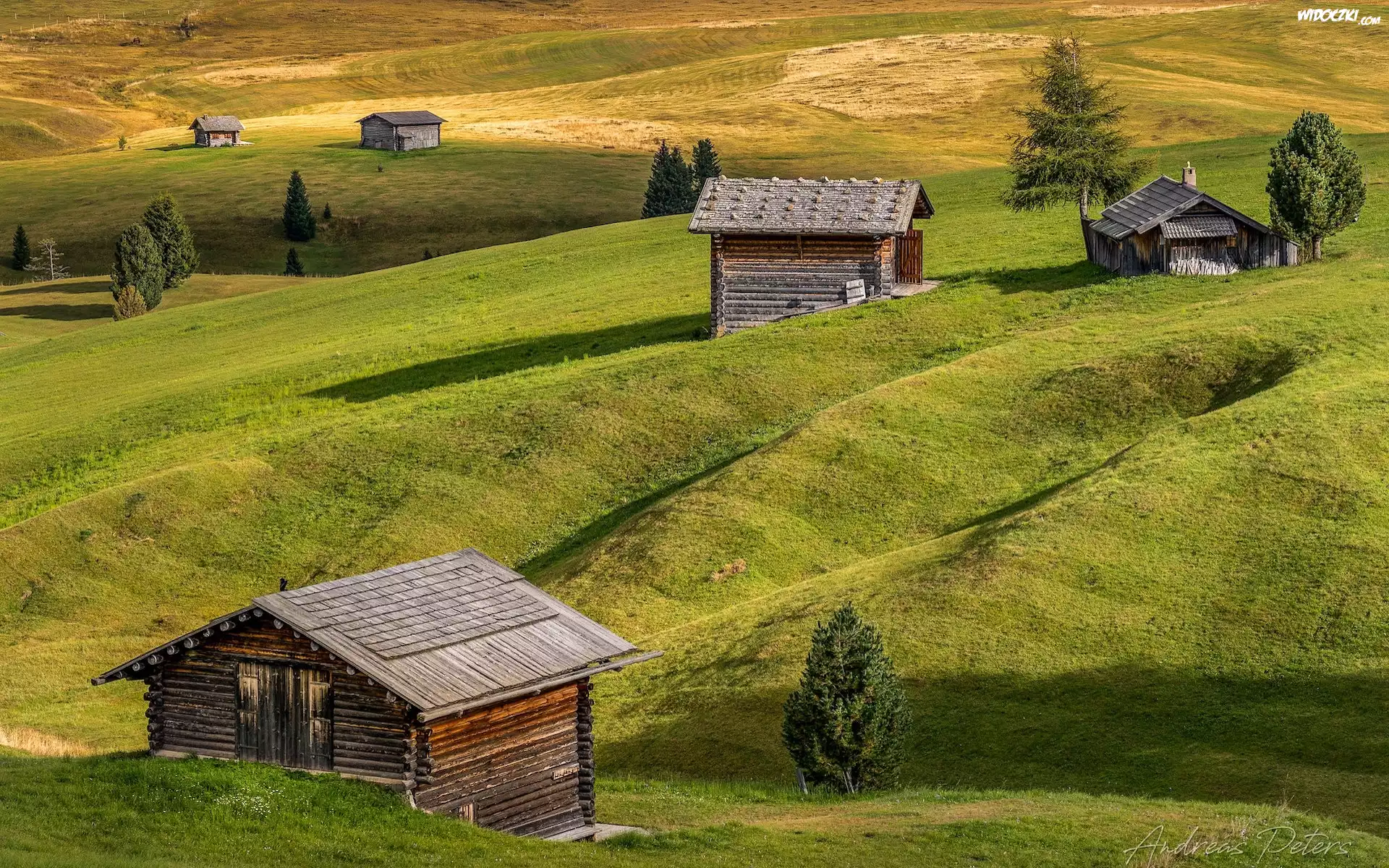 Zdjęcia, Płaskowyż Seiser Alm, Dolina Val Gardena, Wzgórza, Łąki, Drewniane, Domki, Drzewa, Włochy