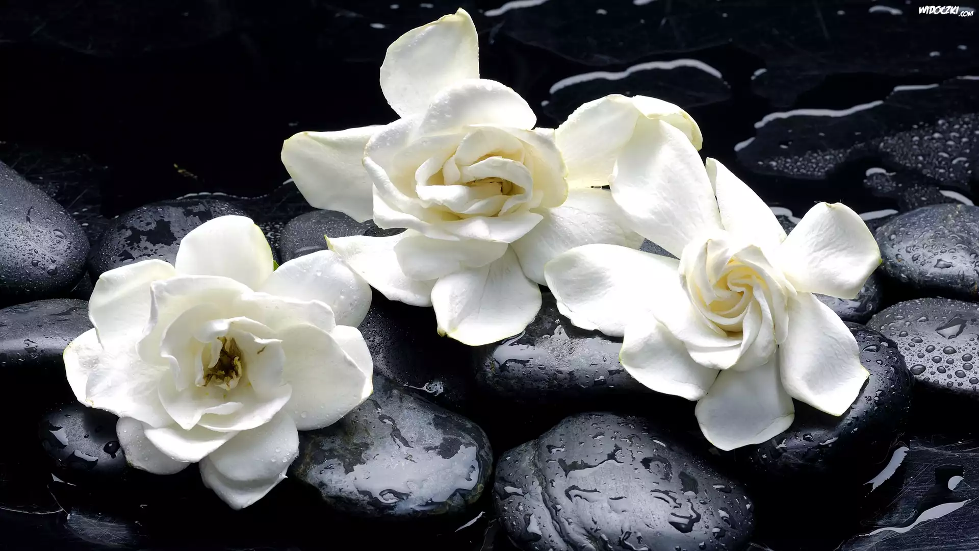 Zdjęcia, Gardenia jaśminowata, Trzy, Białe, Kwiaty, Kamienie
