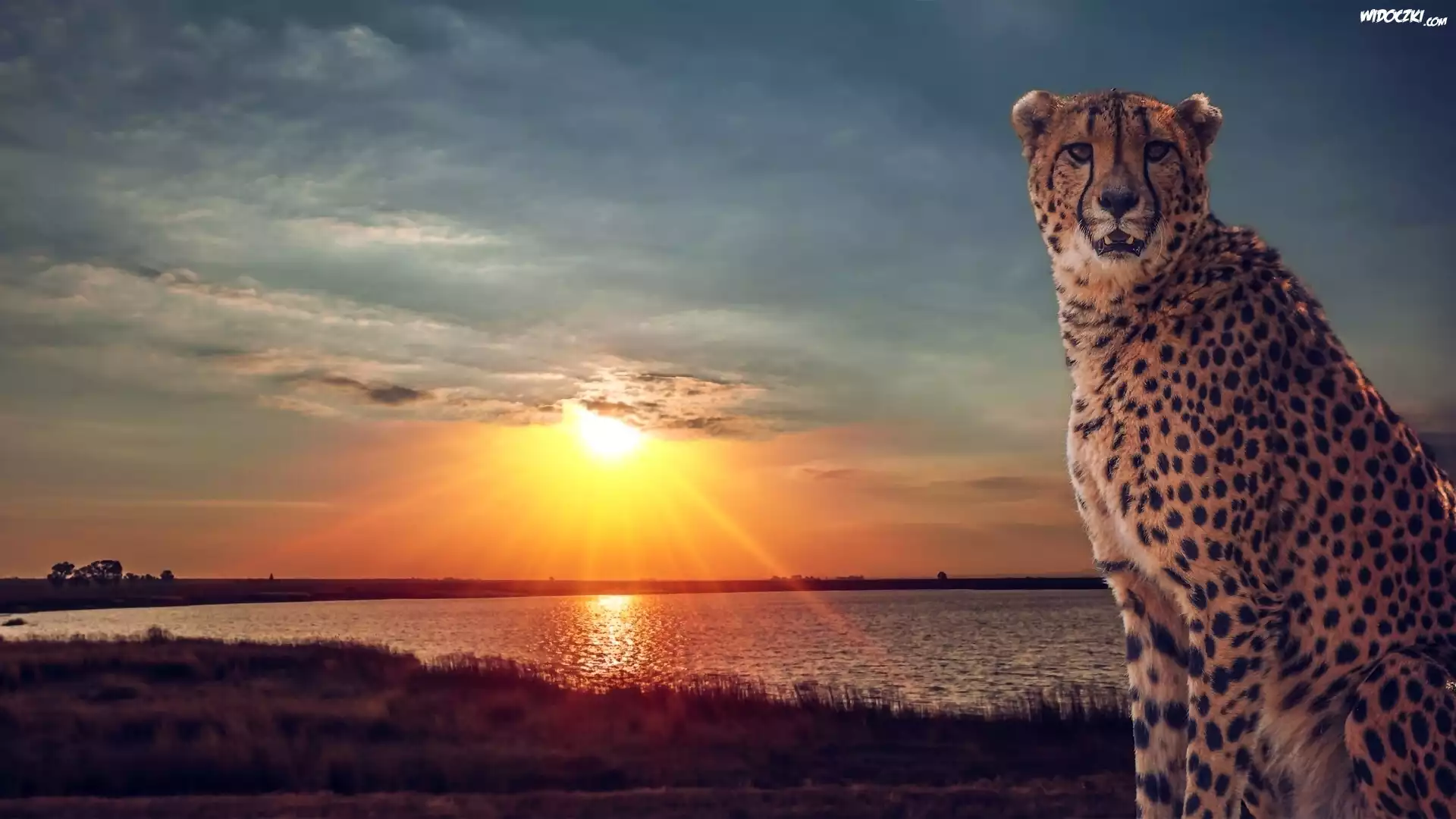 Zdjęcia, Gepard, Jezioro, Zachód, Słońca
