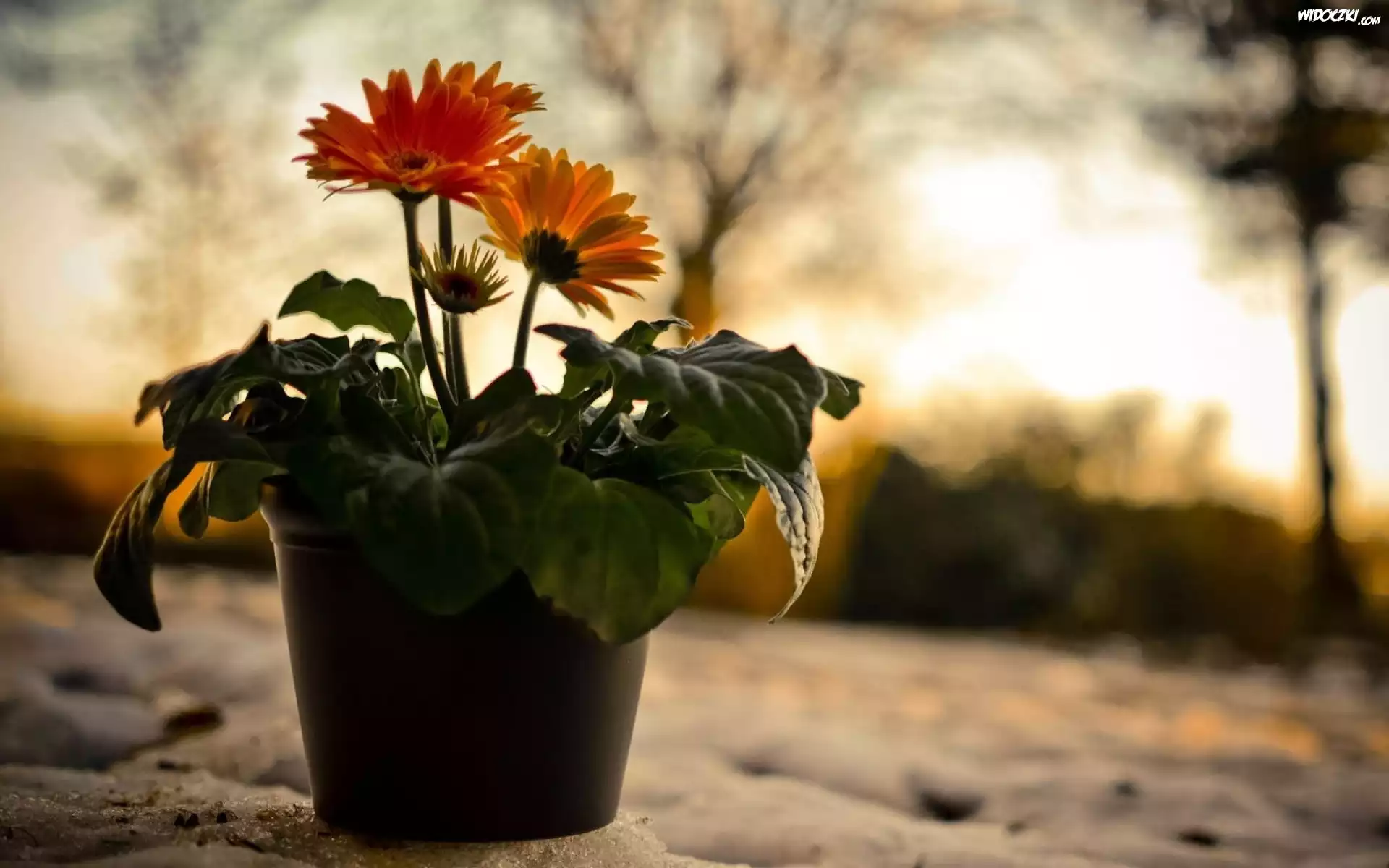 Zdjęcia, Śnieg, Doniczka, Gerbery, Cień
