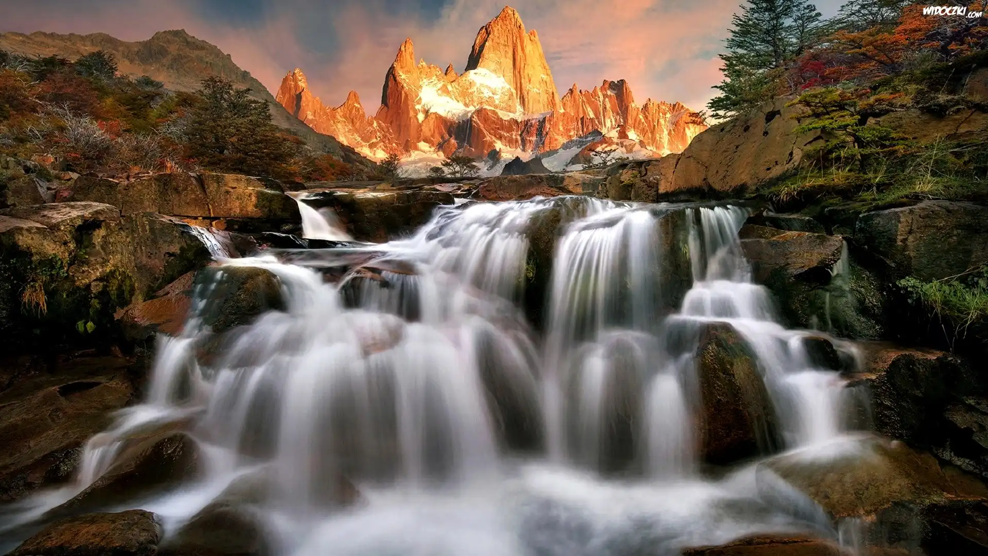 Zdjęcia, Argentyna, Patagonia, Park Narodowy Los Glaciers, Góry, Szczyt Fitz Roy, Wodospad, Drzewa