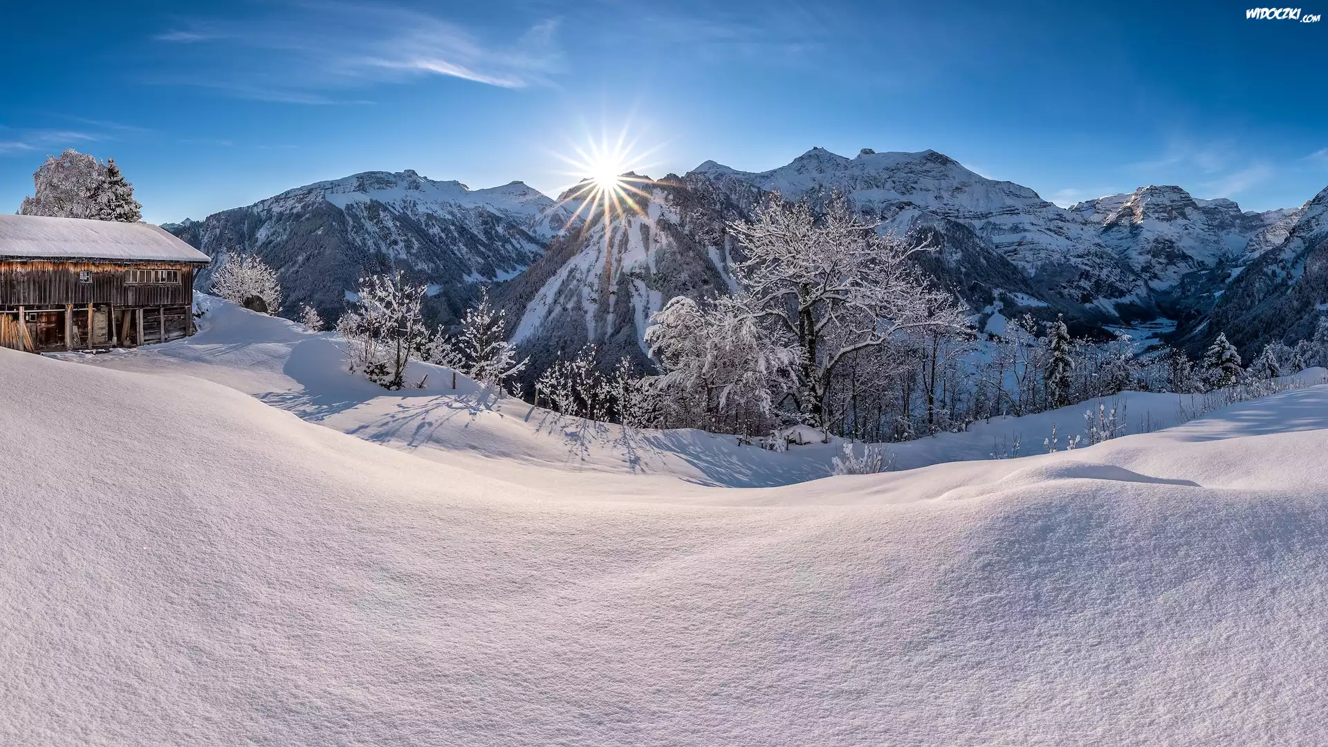 Zdjęcia, Szwajcaria, Kanton Glarus, Góry, Promienie słońca, Zima, Drewniana chata, Drzewa Szwajcaria
