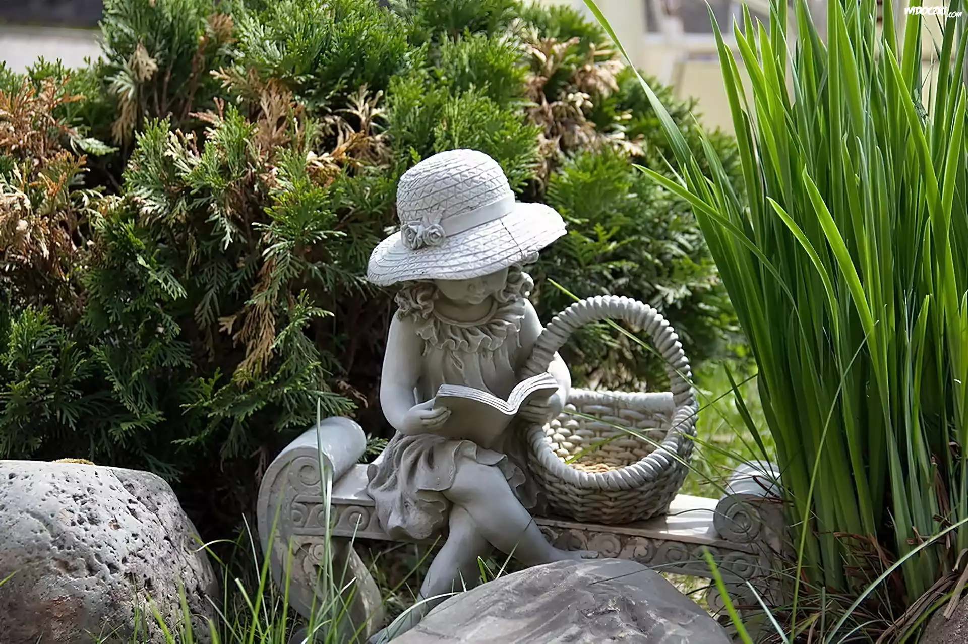 Zdjęcia, Ogród, Głazy, Rzeźba, Ławeczka, Dziewczynka, Koszyk, Książka
