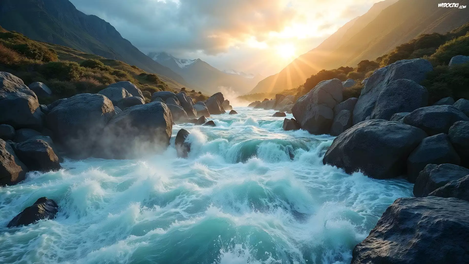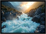 Zdjęcia, Rzeka, Góry, Kamienie, Głazy, Promienie słońca