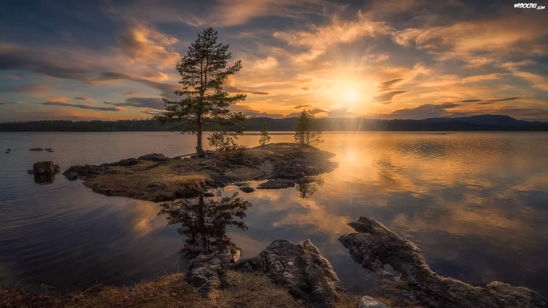 Norwegia, Gmina Ringerike, Wschód słońca, Jezioro, Wysepka, Drzewa