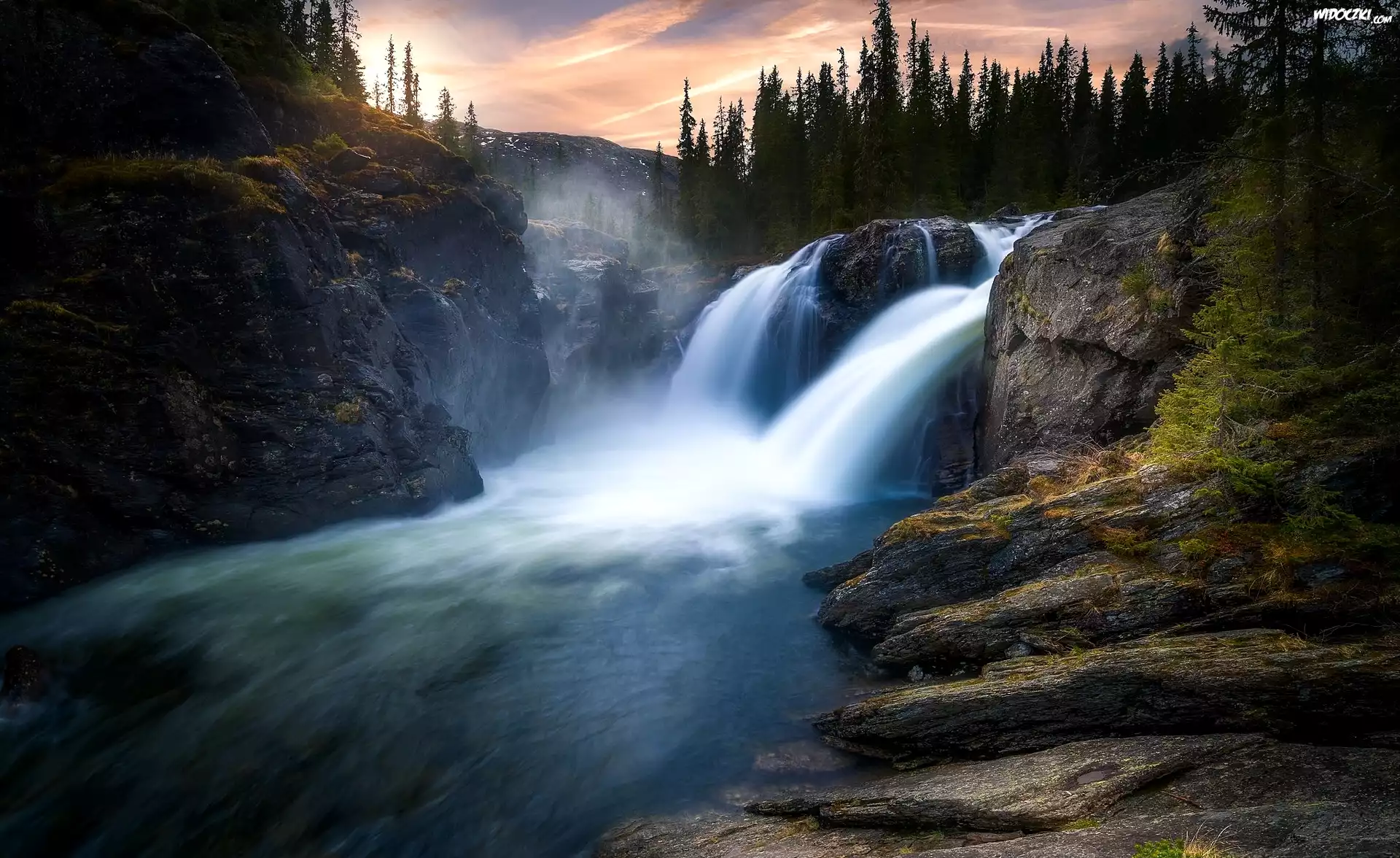 Droga, Skały Kajakarstwo, Wodospad Wodospad, Drzewa, Rzeka Niebo, Morze, Skały Skała, Morze Góra, Skały Wodospad Góra, Skały Wodospad, Spieniona, Woda Skała, Wodospad Rzeczka, Księżyc, Skały, Fantasy Wodospad Drzewa Tęcza, Skała Szeroki Wodospad