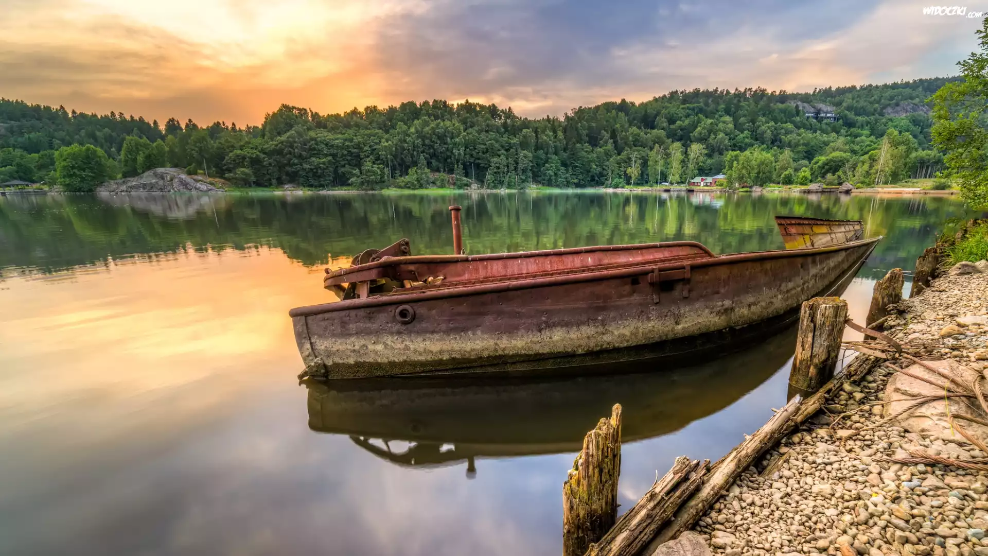 Zdjęcia, Norwegia, Gmina Sarpsborg, Łódka, Jezioro, Wschód słońca