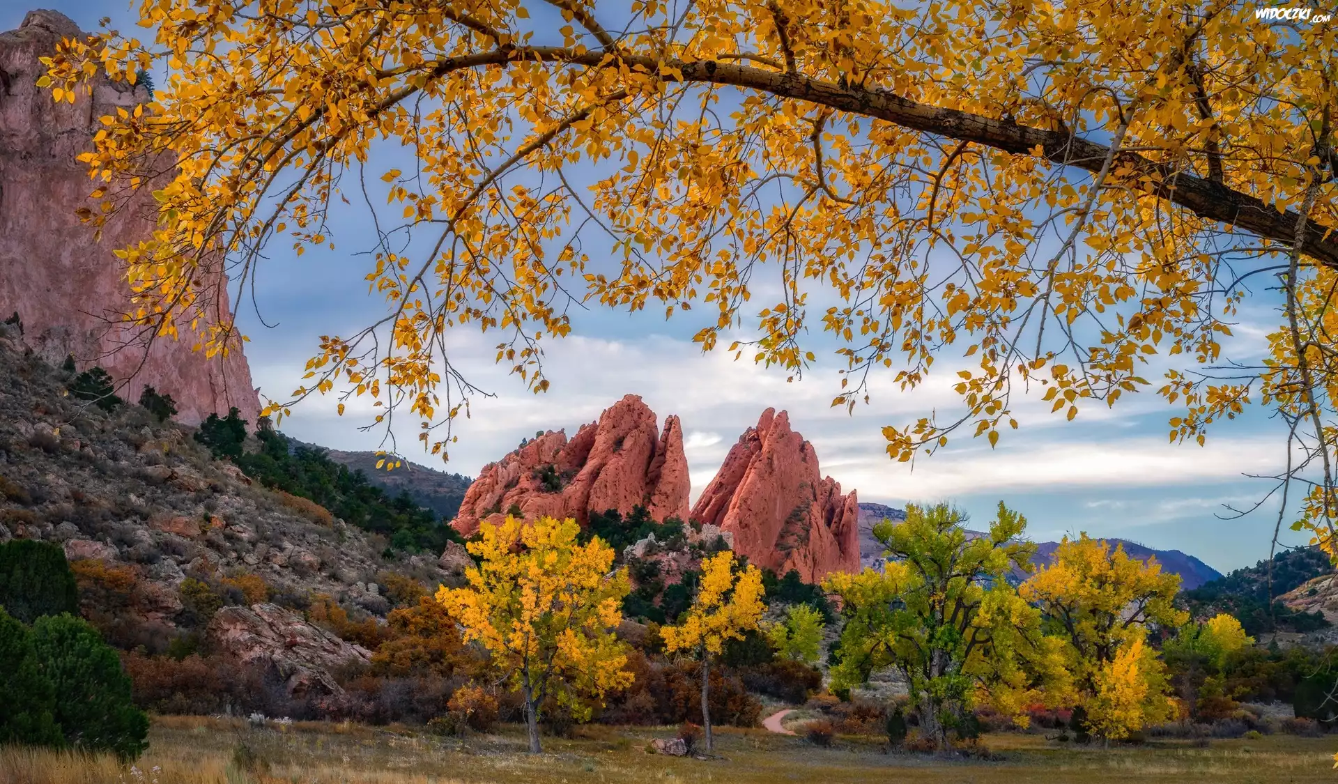 Zdjęcia, Stany Zjednoczone, Kolorado, Garden of the Gods, Góry, Skały, Drzewa, Jesień