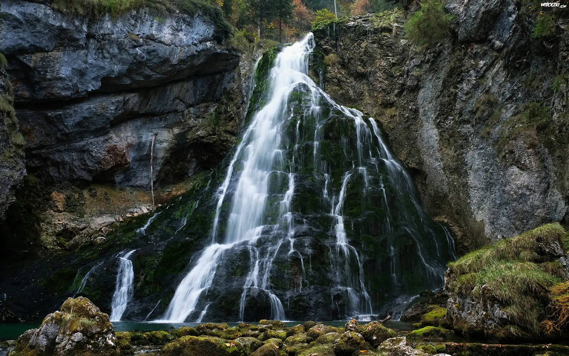 Zdjęcia, Wodospad Gollinger, Skały, Omszałe, Kamienie, Miejscowość Golling, Austria