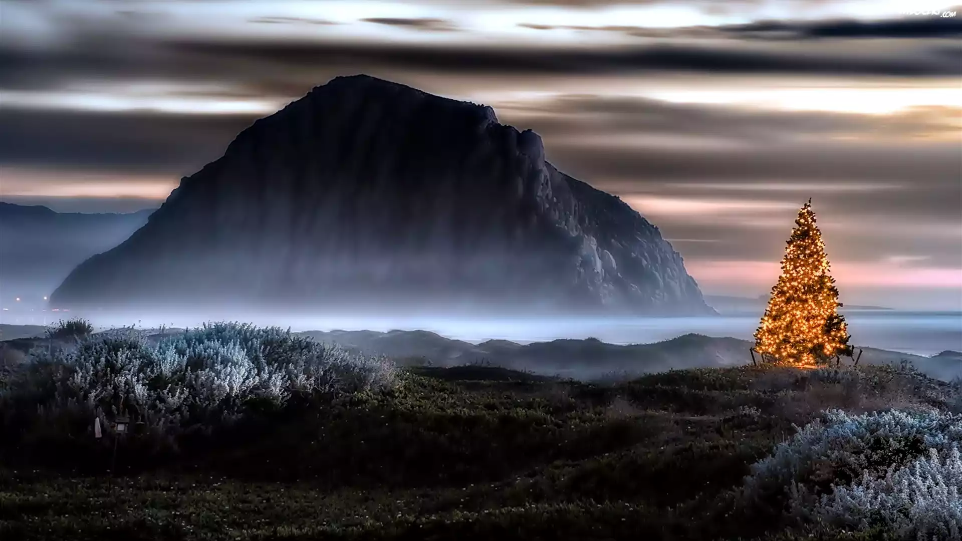 Zdjęcia, Góra, Świecąca, Choinka, Chmury
